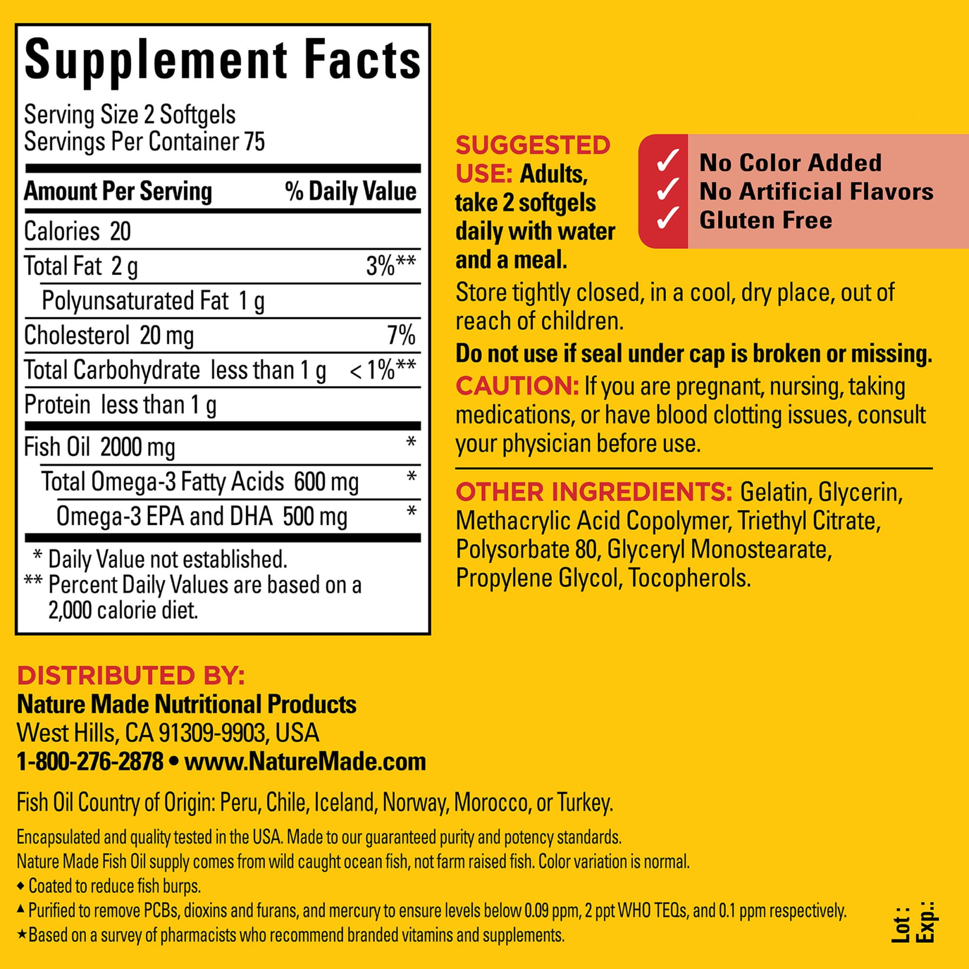 Product Description Nature Made Burp Less (3) Fish Oil 1000 mg 300 mg Omega-3 fatty acids per softgel to help support a healthy heart. A serving of two Nature Made Fish Oil Omega 3 softgels provides 2000 mg Fish Oil with 600 mg Omega-3s (500 mg EPA and DHA). These gluten free and dairy free Fish Oil 1000mg Omega-3 softgels have no color added and no artificial flavors. These Omega 3 Fish Oil softgels are purified to remove mercury (2) from wild-caught ocean fish, not farm-raised fish. Adults, take two of these Omega 3 Fish Oil supplements daily with water and a meal. An Omega 3 supplement like fish oil Nature Made can help provide Omega 3 Fish Oil for men and women. Nature Made DHA EPA Omega 3 supplements are quality you can trust. (2)Purified to remove PCBs, dioxins and furans, and mercury to ensure levels below 0.09 ppm, 2 ppt WHO TEQs, and 0.1 ppm respectively. (3)Coated to reduce fish burps. *Based on a survey of pharmacists who recommend branded vitamins and supplements. These statements have not been evaluated by the Food and Drug Administration. This product is not intended to diagnose, treat, cure or prevent any disease. Brand Story By Nature Made
