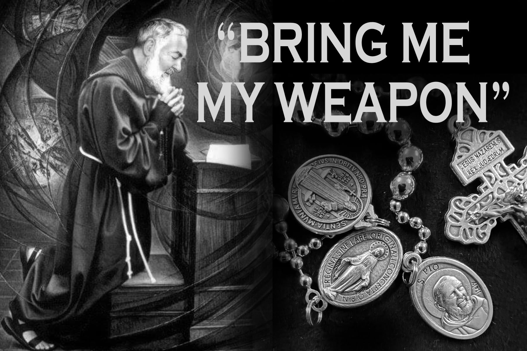 Includes: Padre Pio Combat Rosary Exclusive Padre Pio Medal Miraculous Medal St. Benedict Medal Pardon Crucifix Padre Pio Prayer Card God Strong Mini Prayer Book Burlap drawstring rosary pouch Spiritual Ammo Tin