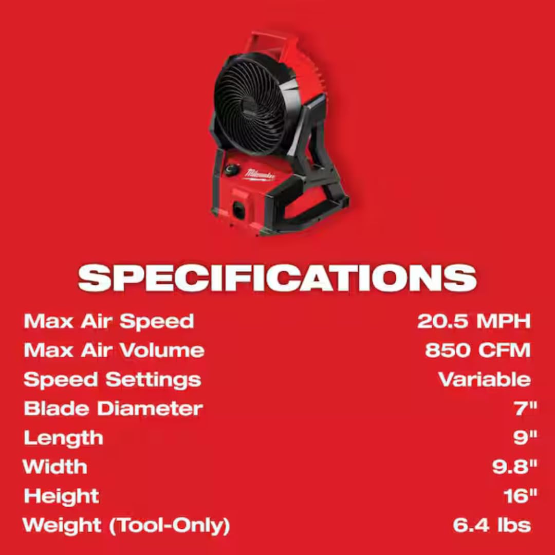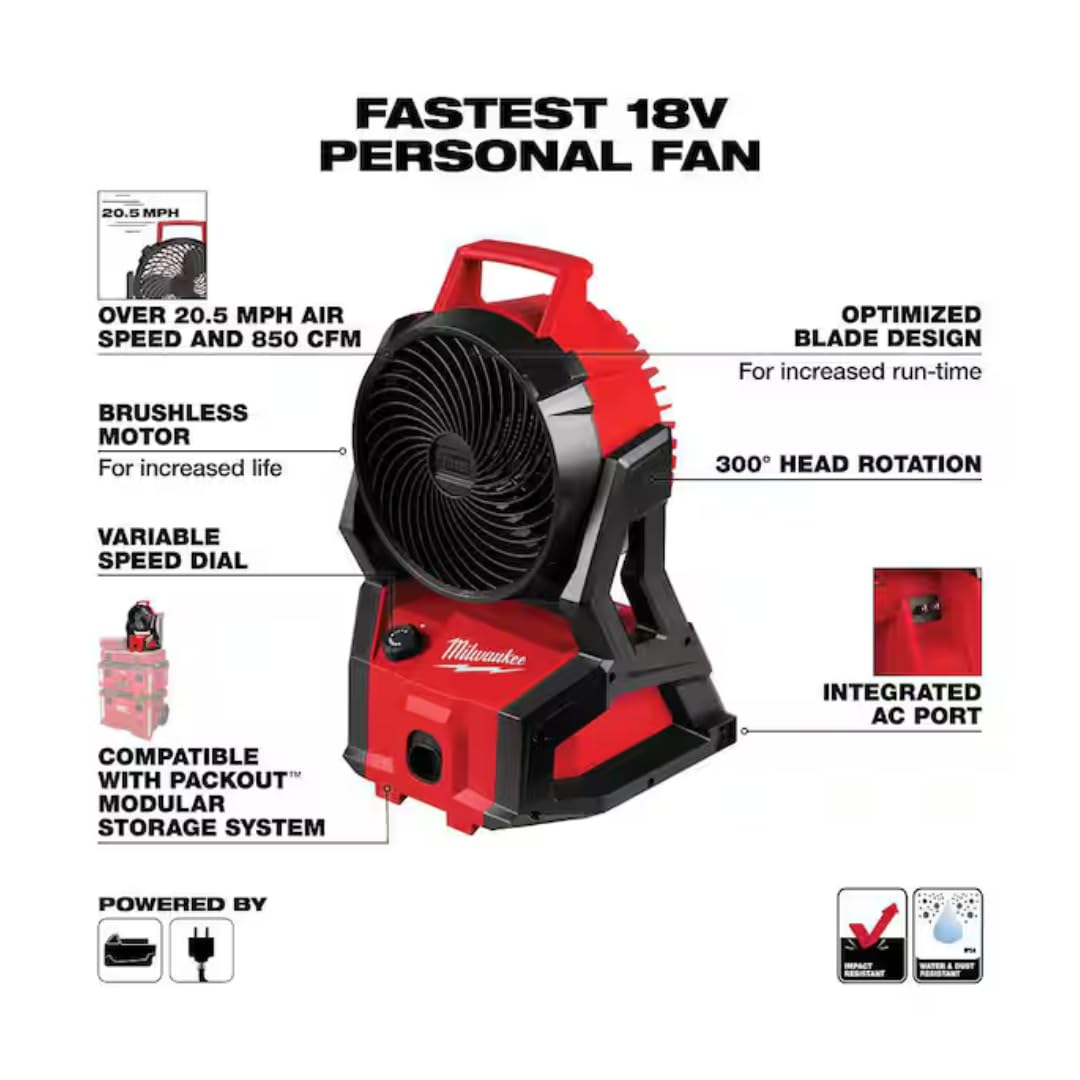 FASTEST 18V PERSONAL FAN Cooling air speed up to 20.5 MPH and 850 CFM Brushless motor for increased life Modular connectivity with All PACKOUT components The M18 REDLITHIUM XC5.0 Battery delivers over 3 hours on high and 6.5 hours at 75% speed