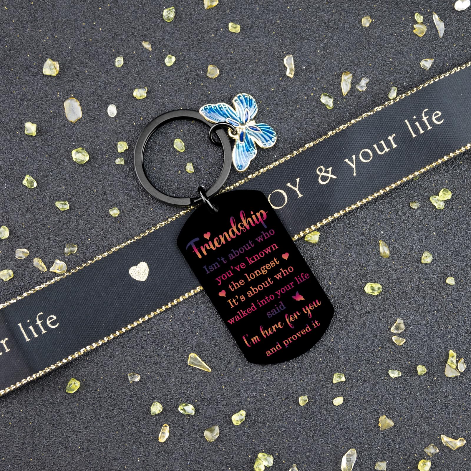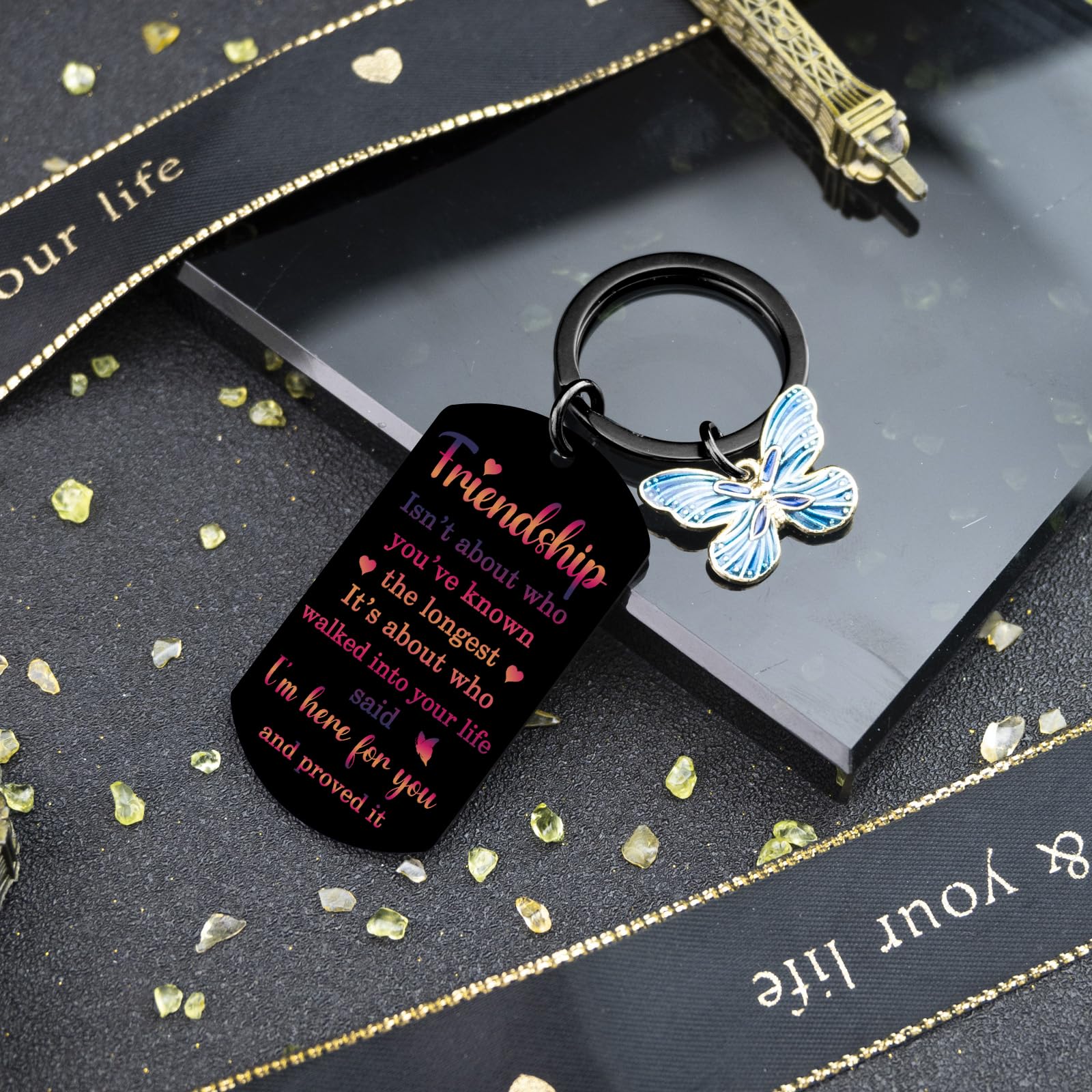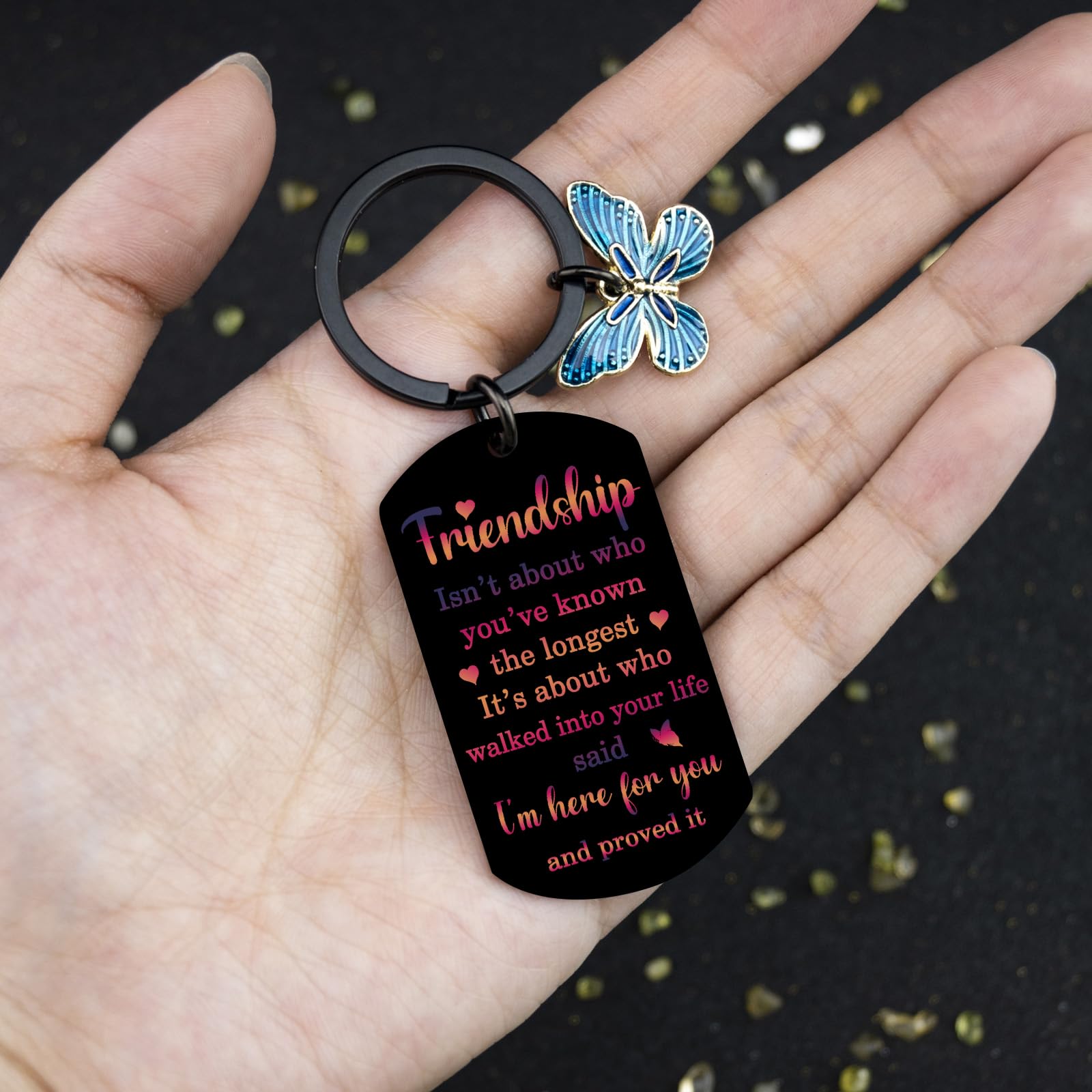 Stocking Stuffers for Friends Valentines Day Gifts Funny Friendship Keychains/long distance relationship/Stocking Stuffers for Adults : This Friendship Gifts Engraved With“ Friendship Isn't About Who You'Ve Known The Longest, It's About Who Walked Into Your Life, Said i'm Here For You And Proved It”, And It Comes With a Blue Exquisite Butterfly Accessory.
