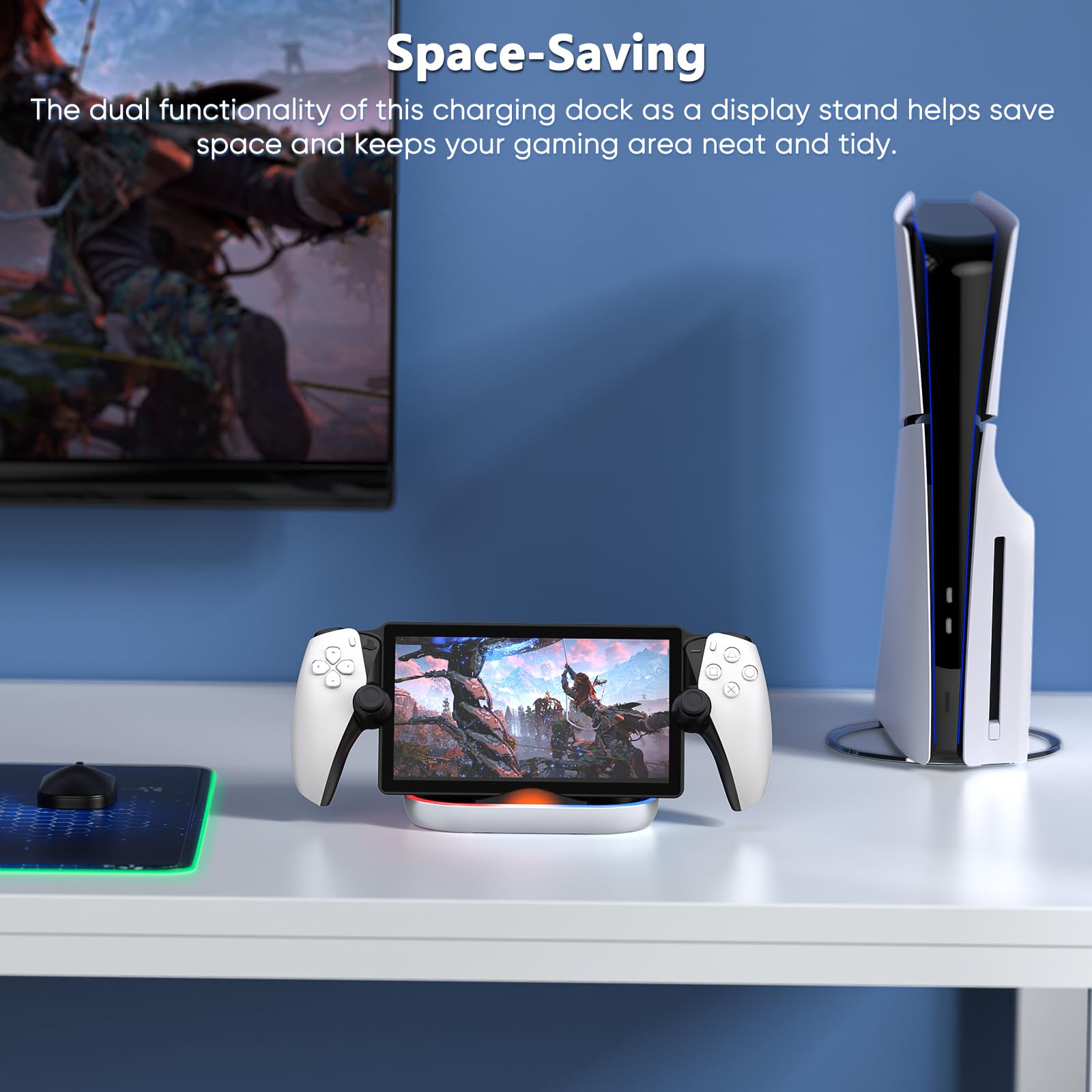 𝙄𝙢𝙢𝙚𝙧𝙨𝙞𝙫𝙚 𝙍𝙂𝘽 𝙇𝙞𝙜𝙝𝙩 𝙎𝙩𝙧𝙞𝙥 𝘽𝙖𝙨𝙚: Elevate your gaming ambiance with a dazzling RGB light at the base of the charging stand, creating a mesmerizing visual experience that sets it apart as an essential part of your PlayStation Portal accessories collection