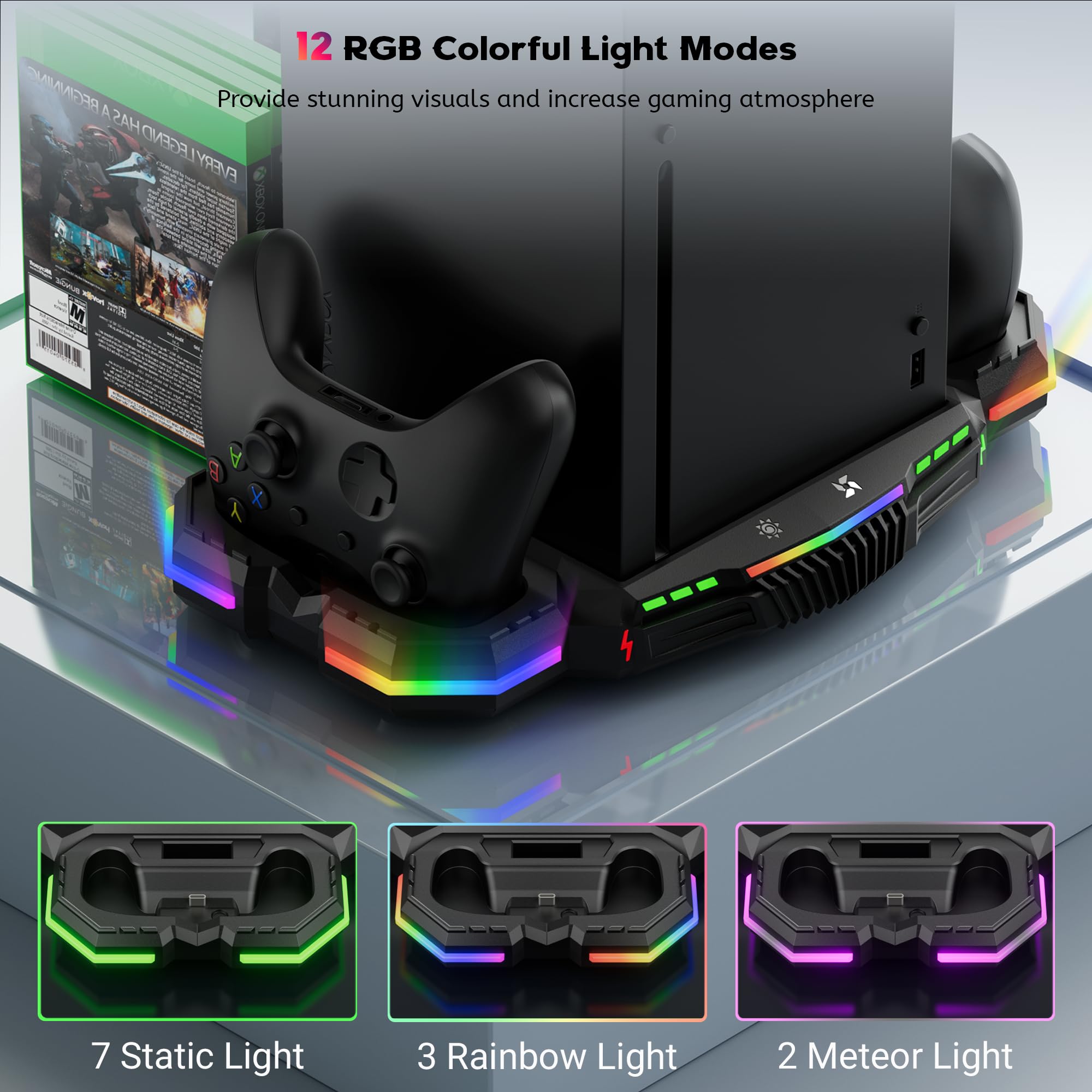 COOL LIGHTING ATMOSPHERE: This upgrade cooling stand with fan for Xbox Series X adds a special light design. It has 13 RGB light effects(5 dynamic modes and 8 static modes). You can choose different effects by touching its switch. The lights and fans are independent, so the light will also glow when the fan turns off. This RGB cooling fan stand for Xbox Series X will provide you with stunning visuals and increase fun atmosphere in your gaming room.