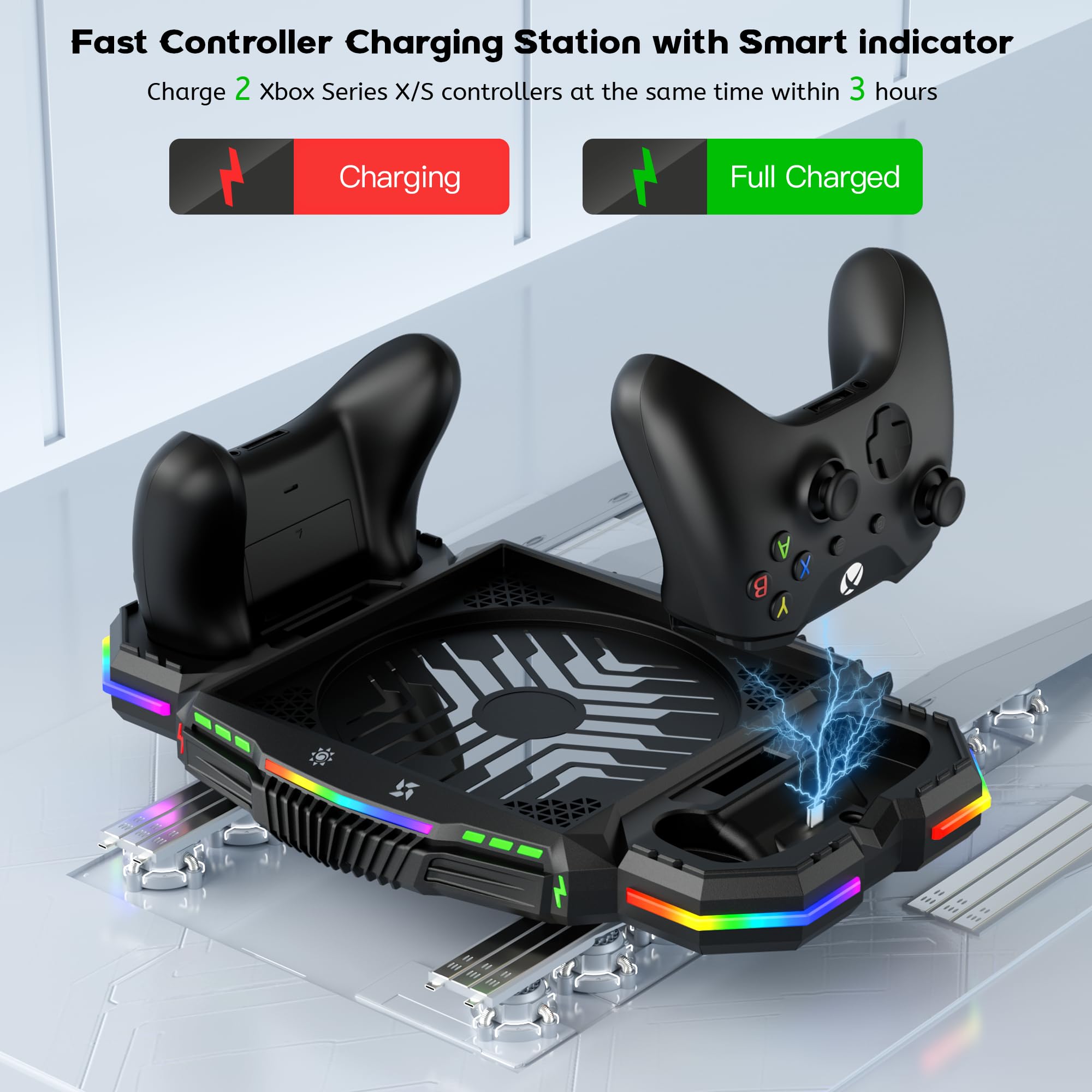 DUAL CONTROLLER CHARGING STATION: This controller charging station for Xbox Series X has 2 charging ports. It can quickly charge 2 controllers within 3 hours. And the smart indicator light on the charger station let you see charging status at a glance: turn red when charging, green means fully charged. This vertical charging stand for Xbox Series X allows your controller to be fully charged fast and ready to use at all time, so that you no longer have to find new batteries frequently.