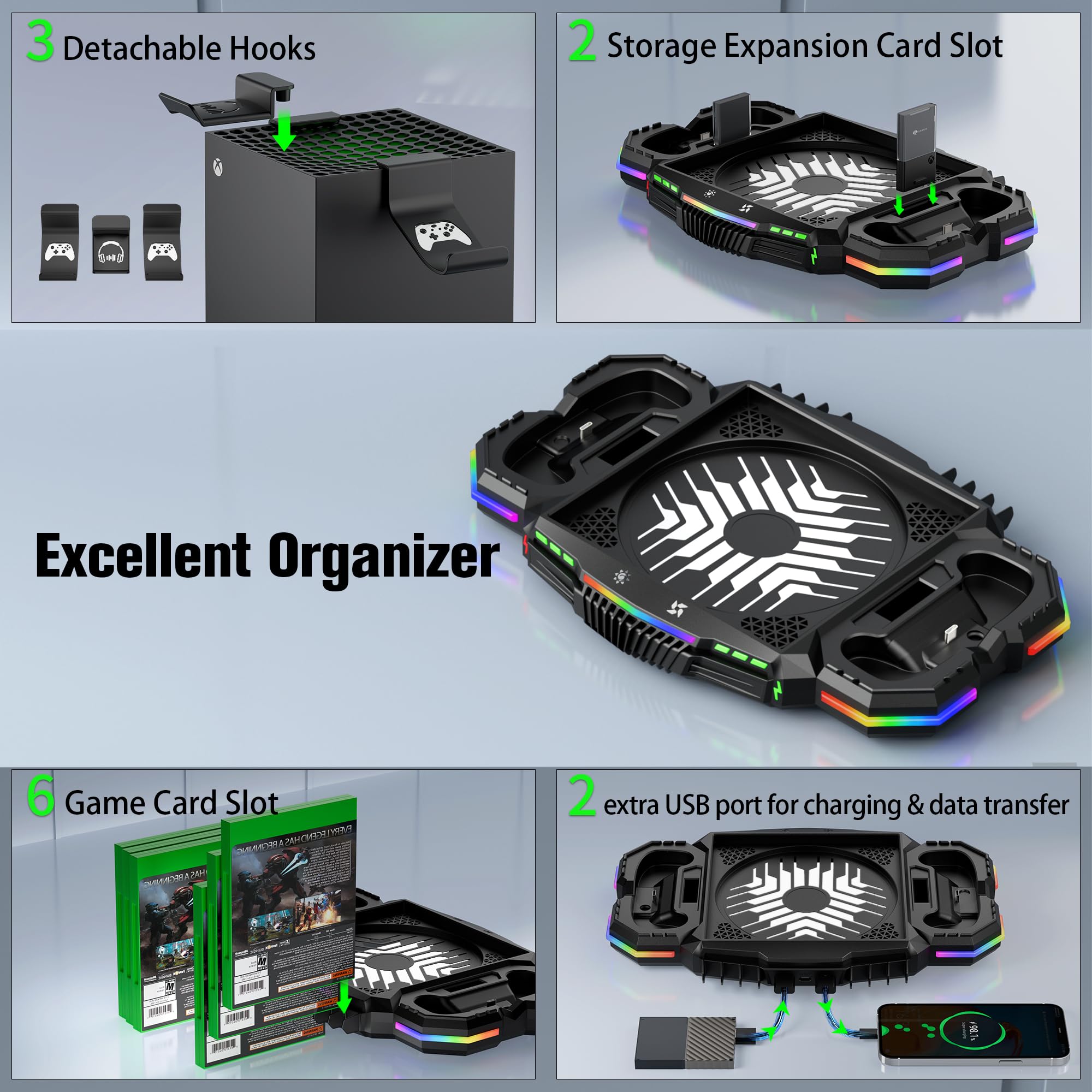 POWERFUL STORAGE DESIGN: There are 6 game card cases and 2 storage expansion card slots on the cooling stand for Xbox Series X to store gaming accessories. And also equipped with 3 hooks to hang your controllers and headphone on the console when you are not using them, which is functional because it keeps all of your necessary gaming accessories for Xbox Series X in one convenient place, eliminating clutter on the desk and keeping your gaming area neat and organized.