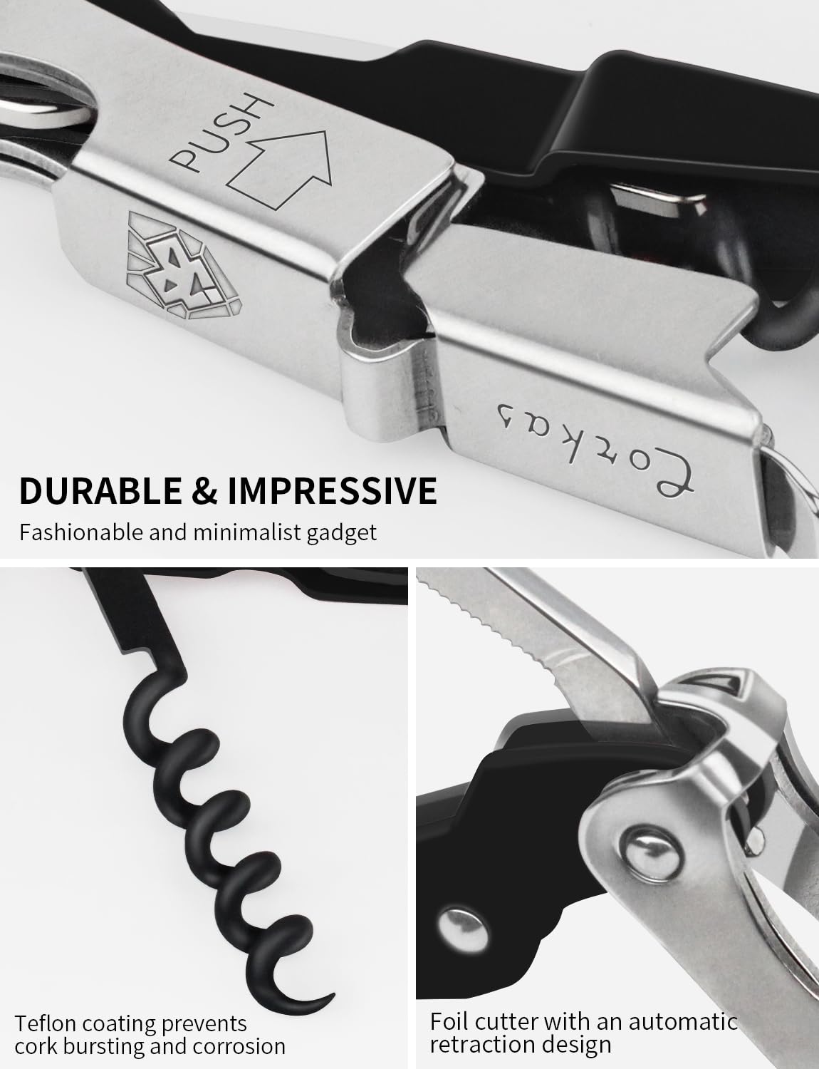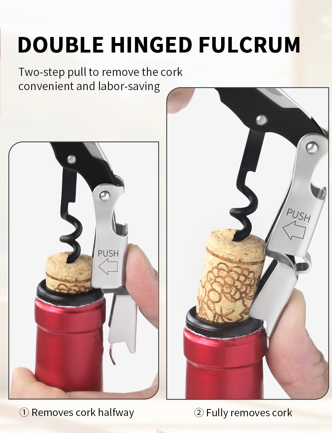 ✅【EFFORTLESS WINE EVERY TIME】Effortlessly glide through any cork with the CORKAS waiters corkscrew. The double-hinged fulcrum provides extra leverage for smoother extraction to ensure smooth, frustration-free uncorking. Its Teflon-coated worm could reduces friction and noise, easier to glide through corks, minimizing wear and tear, No more crumbled corks or wasted time – just perfectly extracted wine, ready to be enjoyed.