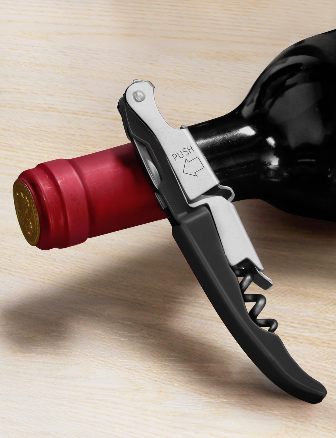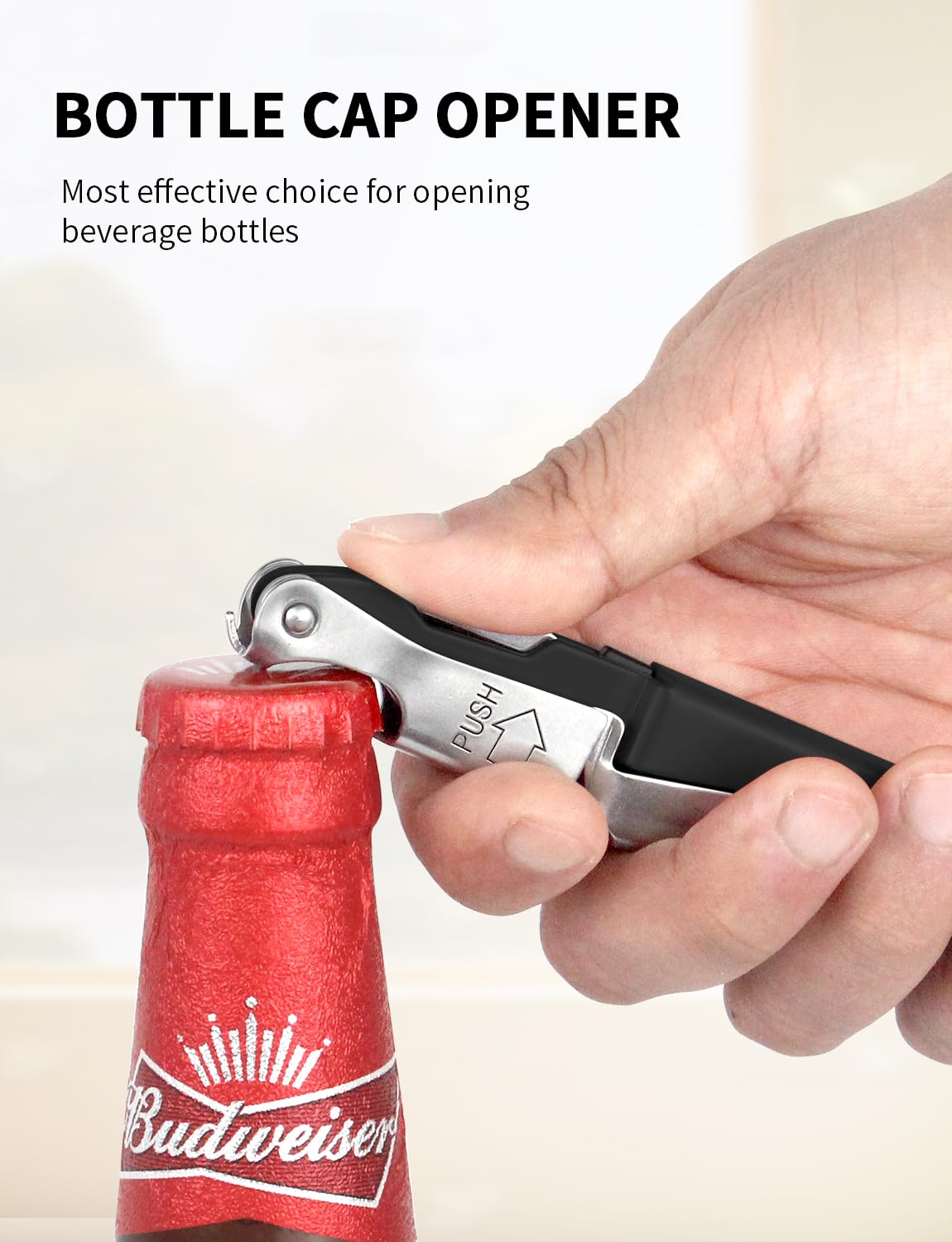 ✅【THE MULTI-TOOL MASTER FOR ALL BEVERAGES】CORKAS bottle opener goes beyond just uncorking wine! This versatile tool features a sharp serrated foil cutter to remove bottle seals and a built-in bottle cap opener. After cutting the foil, just pull open the lever arm, the knife will close automatically! Whether you're enjoying a glass of wine, a refreshing beer, or a bubbly soda, the CORKAS is your one-stop shop for effortless beverage opening.