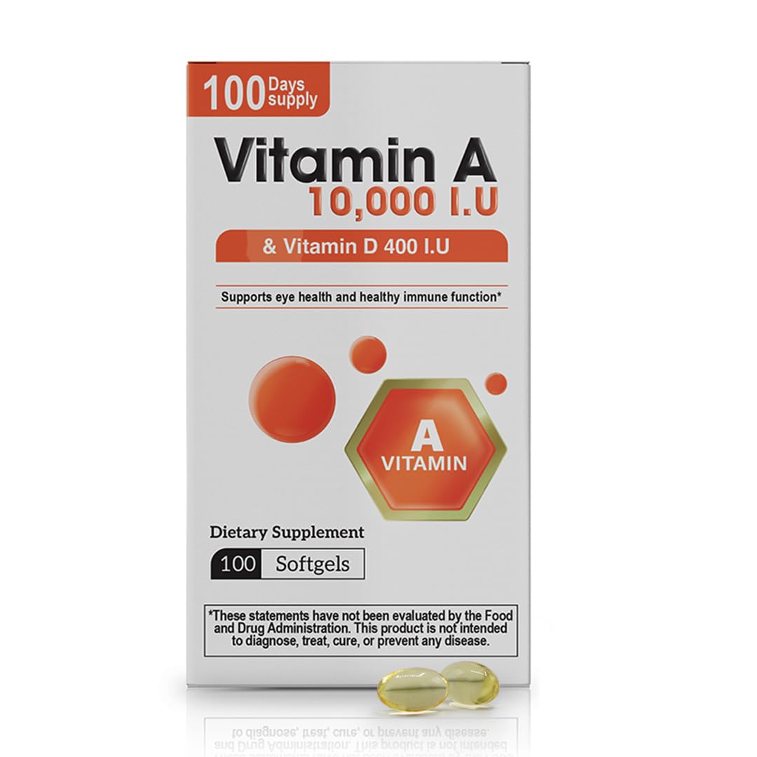 High Potency Vitamin A & D Supplement – Each softgel provides 10,000 IU Vitamin A (Retinyl Palmitate) + 400 IU Vitamin D3 (Cholecalciferol) for daily use.