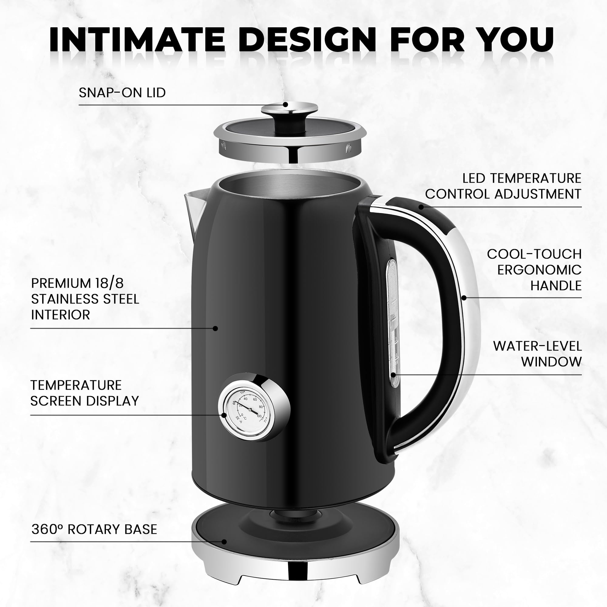 EXCELLENT WORKMANSHIP AND DESIGN: The electrical kettle features a lift-off lid and wide-diameter design, making it easier to clean and catch water. The snap design of the lid increases stability and makes pouring safer. The base combines storage and non-slip features, which is both practical and beautiful