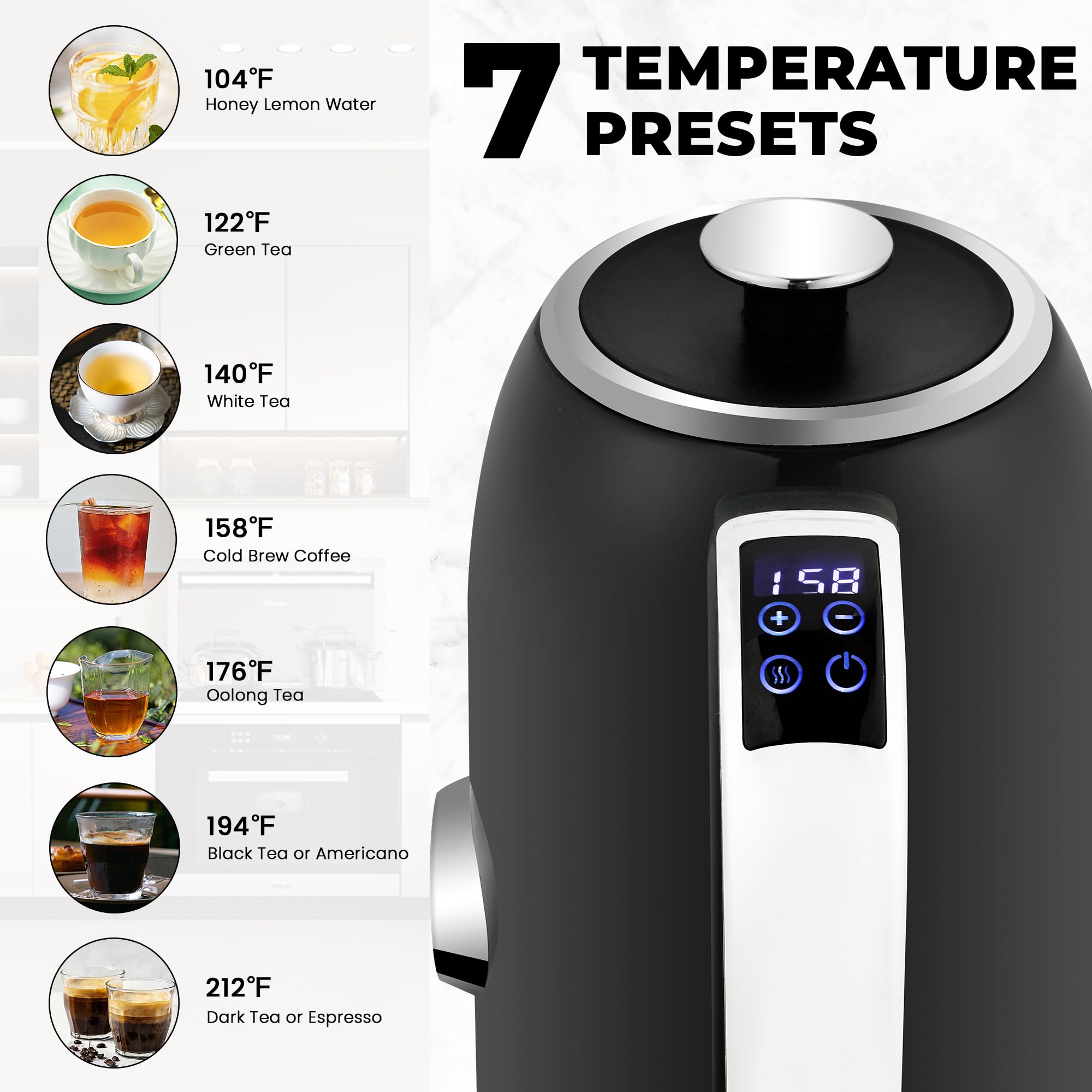 7 ONE-TOUCH PRESETS: This water boiler features 7 smart presets, including settings for: 104°F for honey lemon water, 122°F for green tea, 144°F for white tea, 158°F for delicate teas or cold brew coffee, 176°F for Oolong Tea, 194°F for black tea or americano, 212°F for French press coffee, and a Boil option suitable for black tea or instant foods