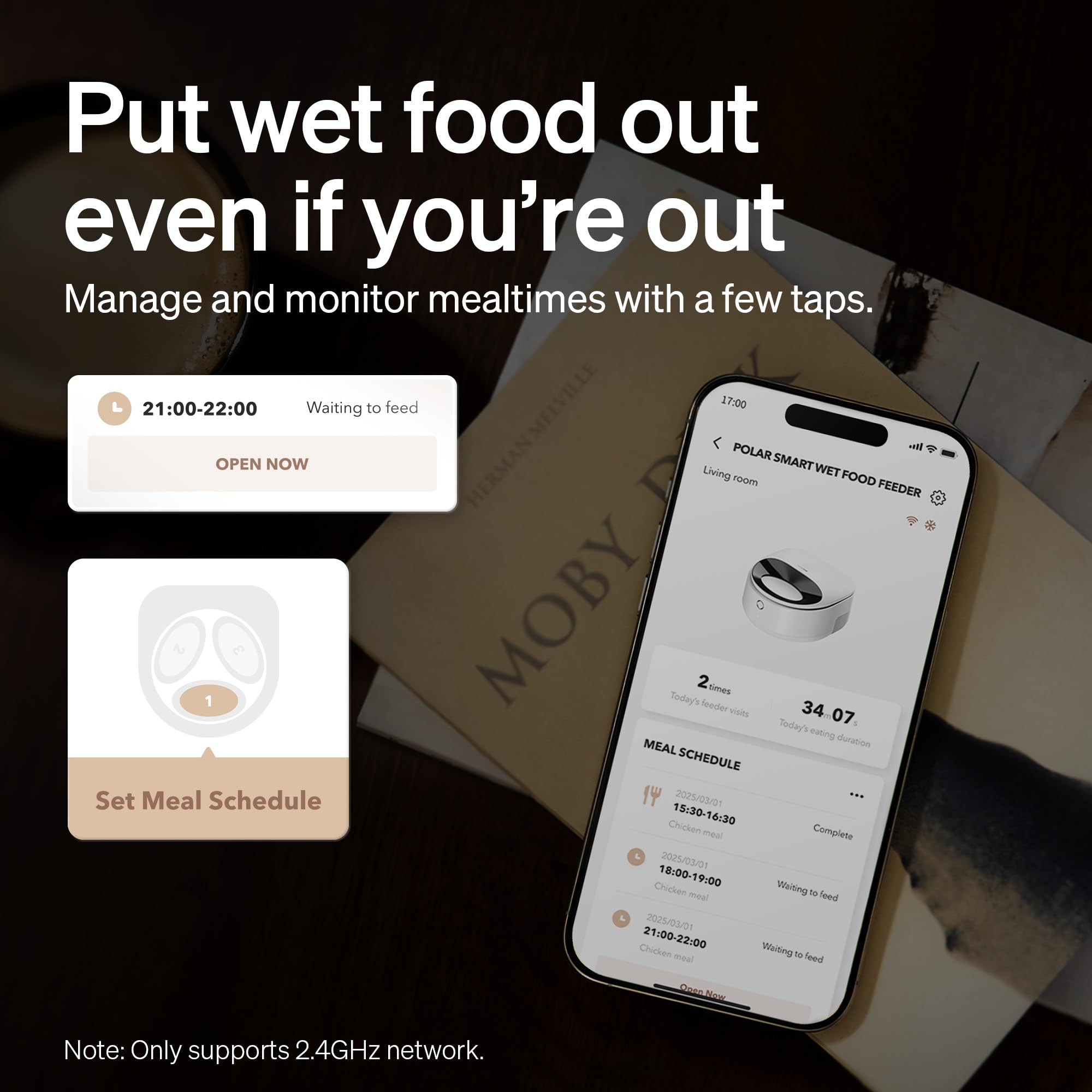 Smart App Control for Hassle-Free Feeding: Schedule meals, monitor feeding status, and dispense food instantly from anywhere using the PETLIBRO's dedicated app of the automatic cat food dispenser for wet food(Only supports 2.4GHz network), the remote "Feed Now" feature lets you reopen a previous unfinished meal to ensure no portion goes to waste and open the next meal ahead of time. If you do not set any schedule, "Feed Now" also can help to open the lid anytime anywhere.