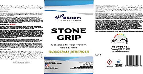 SlipDoctors stone-grip will dramatically increase traction and improve safety on wet and dry stone floors. The slip resistance will surpass guidelines recommended by ADA/OSHA for floor safety. It is easy to use. To treat, first clean and dry the flooring. Next, apply the treatment and rinse off. A long-lasting answer to the problem of slippery wet floors. It features a water based treatment, increases the co-efficient of friction, easy application and low odor, little or no appearance change, one application can last over two years, can be used indoors or outdoors. Immediate usage after application. One quart will treat between 50 to 75 square feet. Application temperature: above freezing. Evaporation can occur at higher temperatures.. It is biodegradable. 5 Years shelf life. 2-5 Years treatment life. Application: surface must be free from wax, sealant and grease. Dilution is not necessary. Apply using mop or hand sprayer. Neutralizer: fresh water with 2-3 table spoons of baking soda. Exposure time: 5-20 minutes. Initial testing suggested.. Clean up: fresh water and ph neutral floor cleaner. Ongoing maintenance: no change in procedures necessary. Slip resistance: Exceeds American Society of Testing Materials (ASTM) and Underwriters Laboratory (UL) of 0.50 COF. Typical applications hotels, motels, resorts, hospitals, nursing homes, assisted living, restaurants, factories, apartments, health clubs, shopping malls, office buildings, swimming pool decks, bathroom floors, showers and staircases.