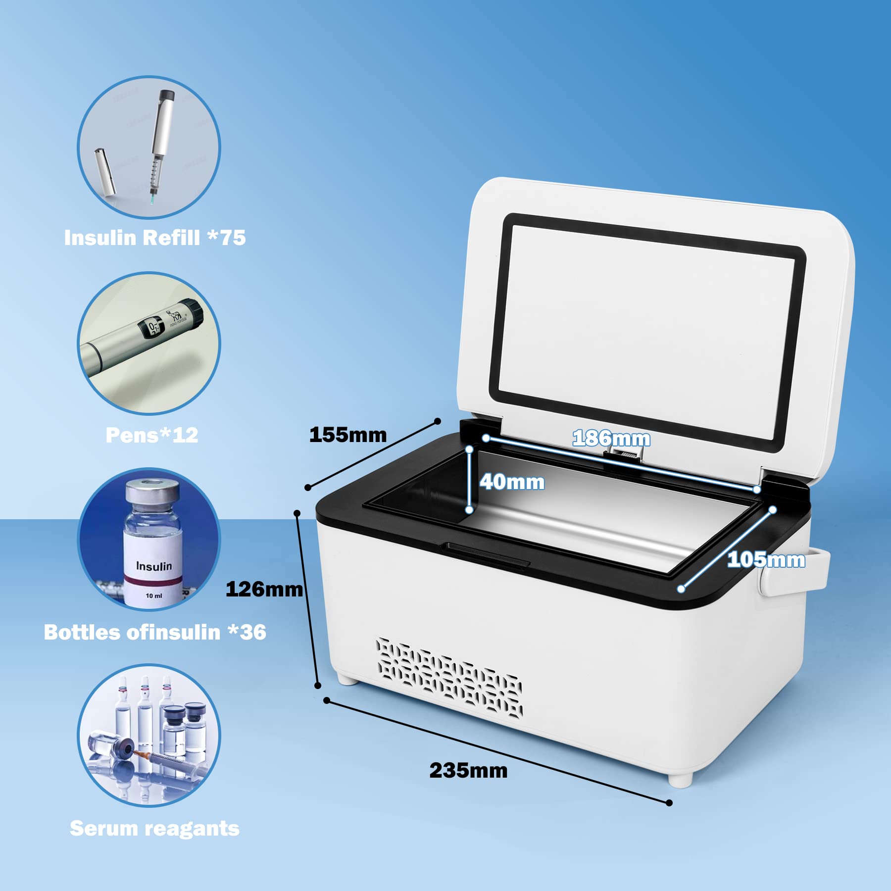 [Big Capacity, Travel-Friendly Size] Internal size 7.32 × 4.13 × 1.57 in — holds up to 12 insulin pens, 36 vials, or 72 refills inside a compact body. Perfect for daily use, long flights, or business trips. Rounded inner corners protect your medicine from bumps while traveling.
