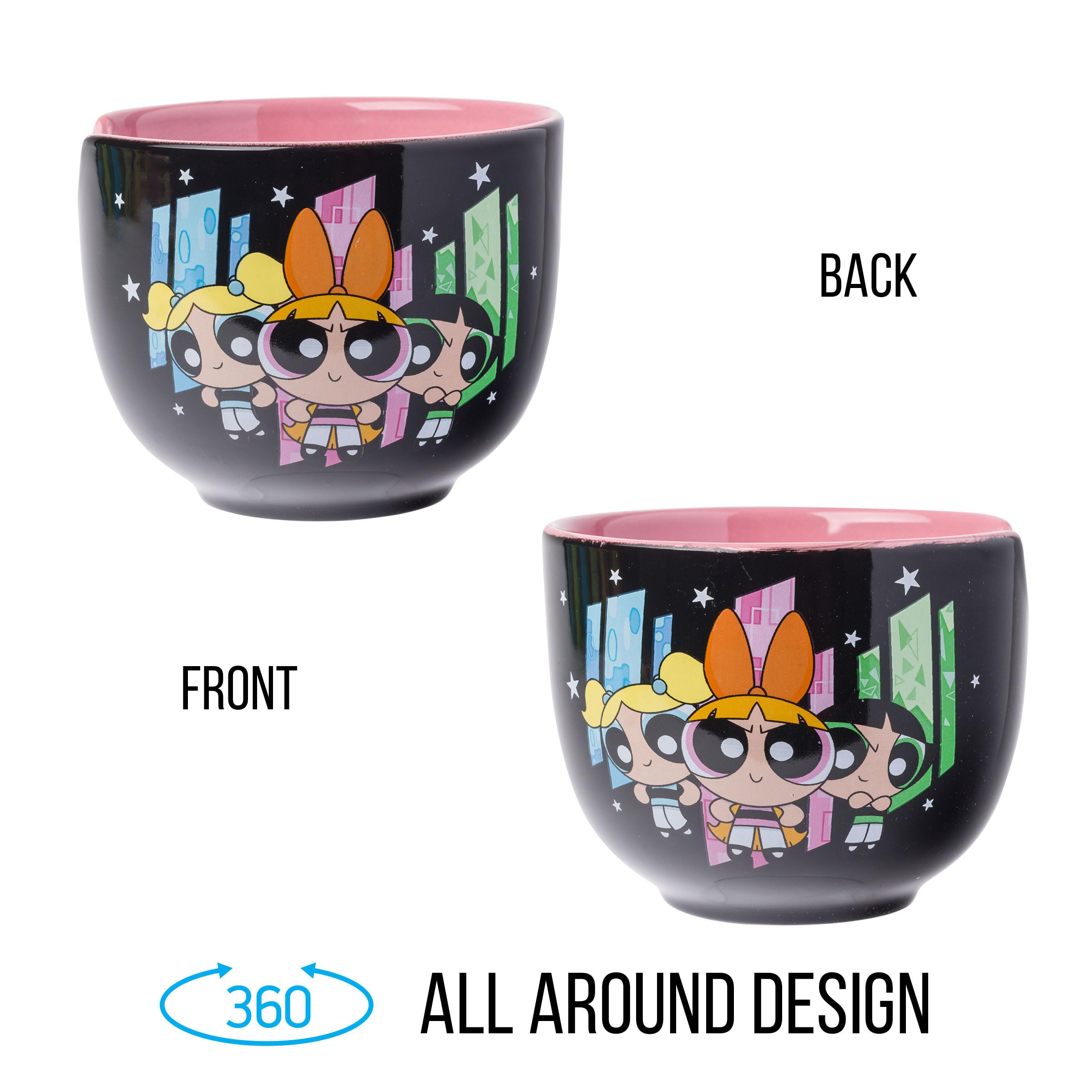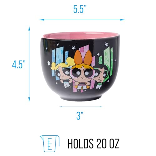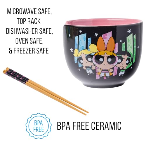 RAMEN BOWL: Enjoy a steaming bowl of ramen in this awesome Power Puff Girls 20oz. Ceramic Ramen Bowl with Chopsticks. Featuring your favorite trio (Buttercup, Bubbles, & Blossom) against a black background along with a pink interior
