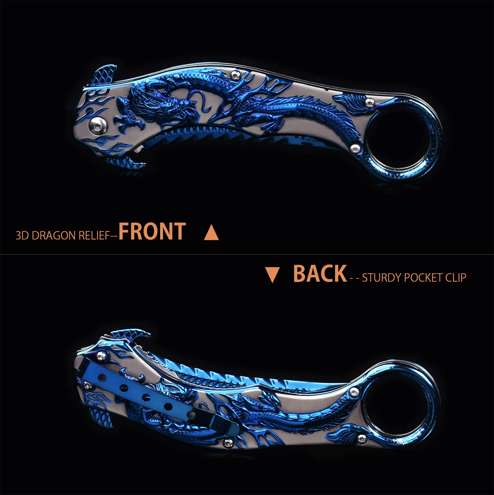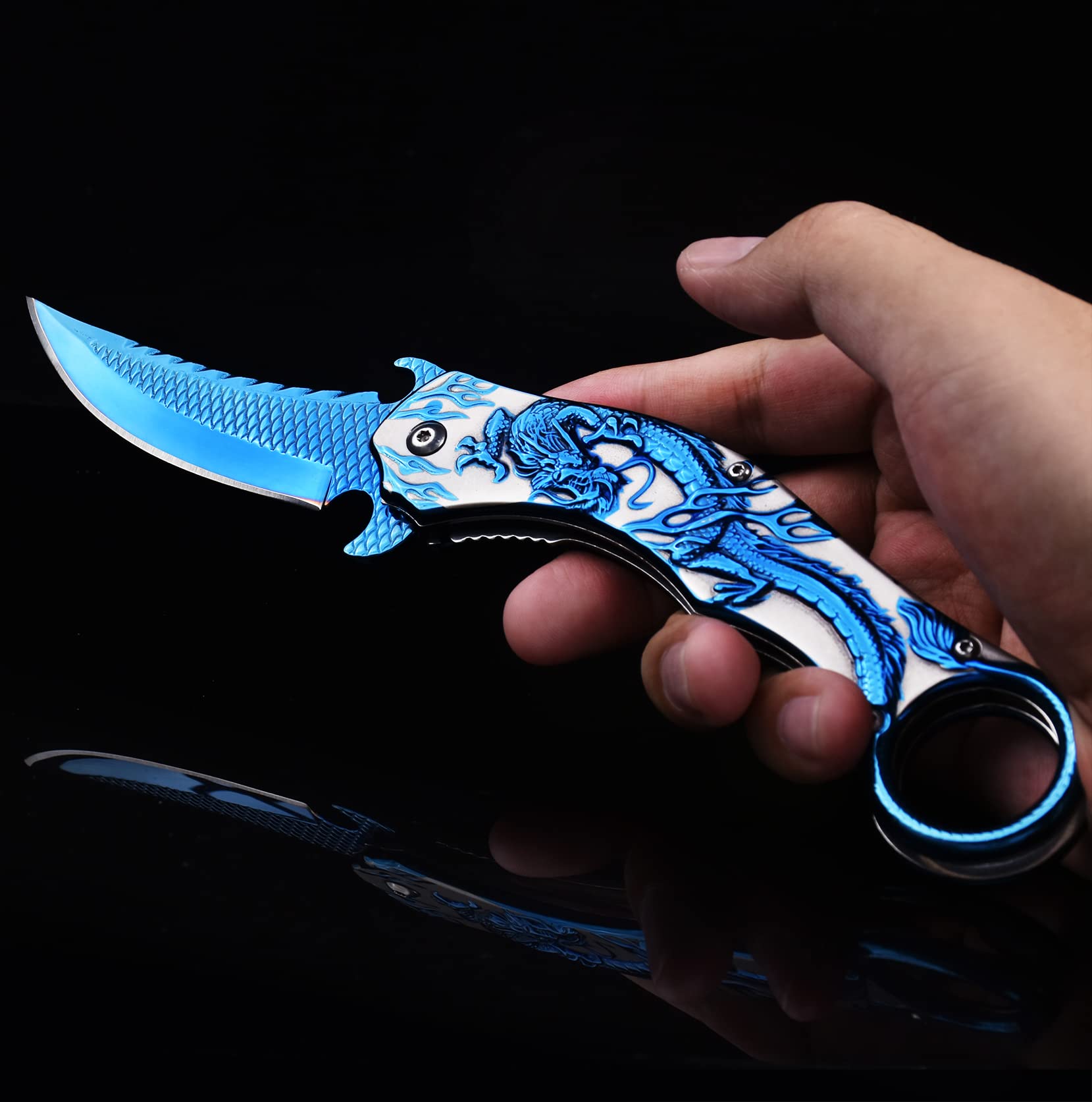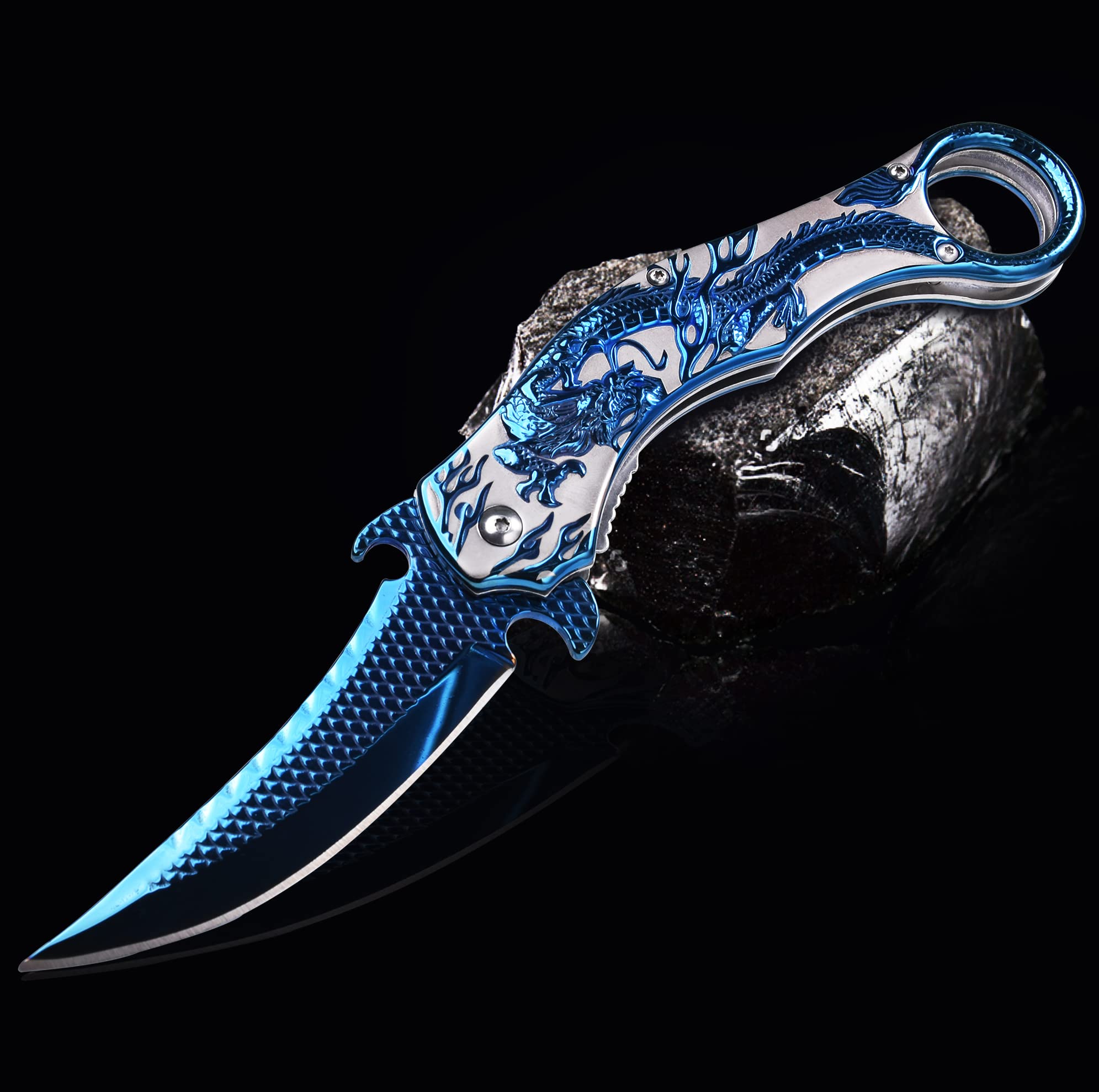 【Best Gift for Men and Boys】: The personalized dragon pocket knife is a perfect gift for men and women. Whether camping, hiking, fishing, survival, climbing, cycling, or daily cutting tasks, a cool folding knife will be a good helper to carry with you.
