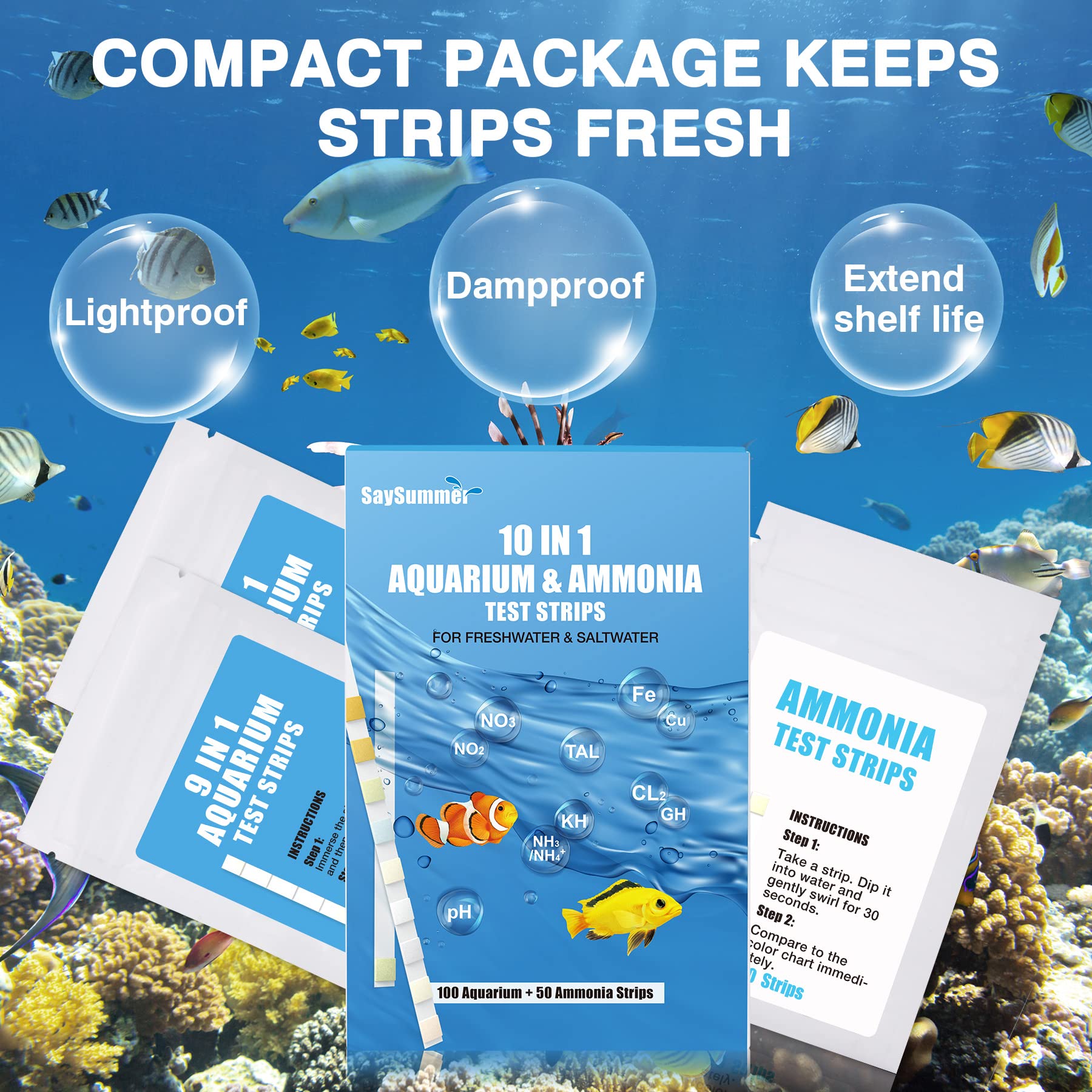 RREMIUM MATERIAL - Aquarium test kits freshwater saltwate select high quality and highly sensitive material, providing reliable results and clear readings with out color bleeding. 150 Strips (100 for 9 in 1, and 50 for ammonia) sealed in 3 re-sealable aluminium foil pouches separately. Damp-proof and light-proof, keeps strips fresh with compact body.