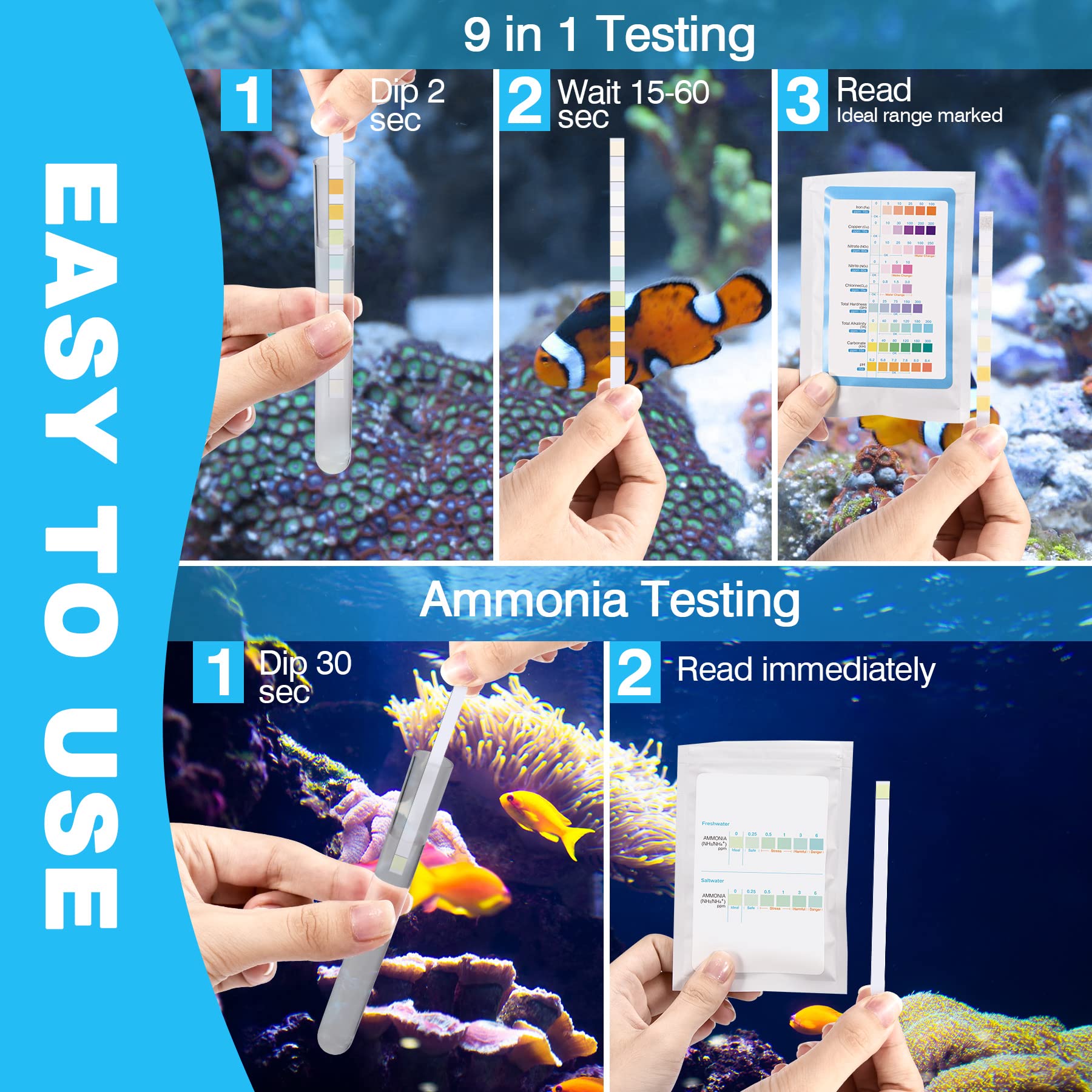 EASY TO HANDLE - Both fish tank test strips and ammonia test strips for aquariums are easy to use. Everyone can assure a healthy water by easy steps. For aquarium testing strips, simply dip 2sec, hold 15-60sec, then compare to the color chart. For ammonia testing strips, just dip and gentle swirl for 30 sec and compare immediately.