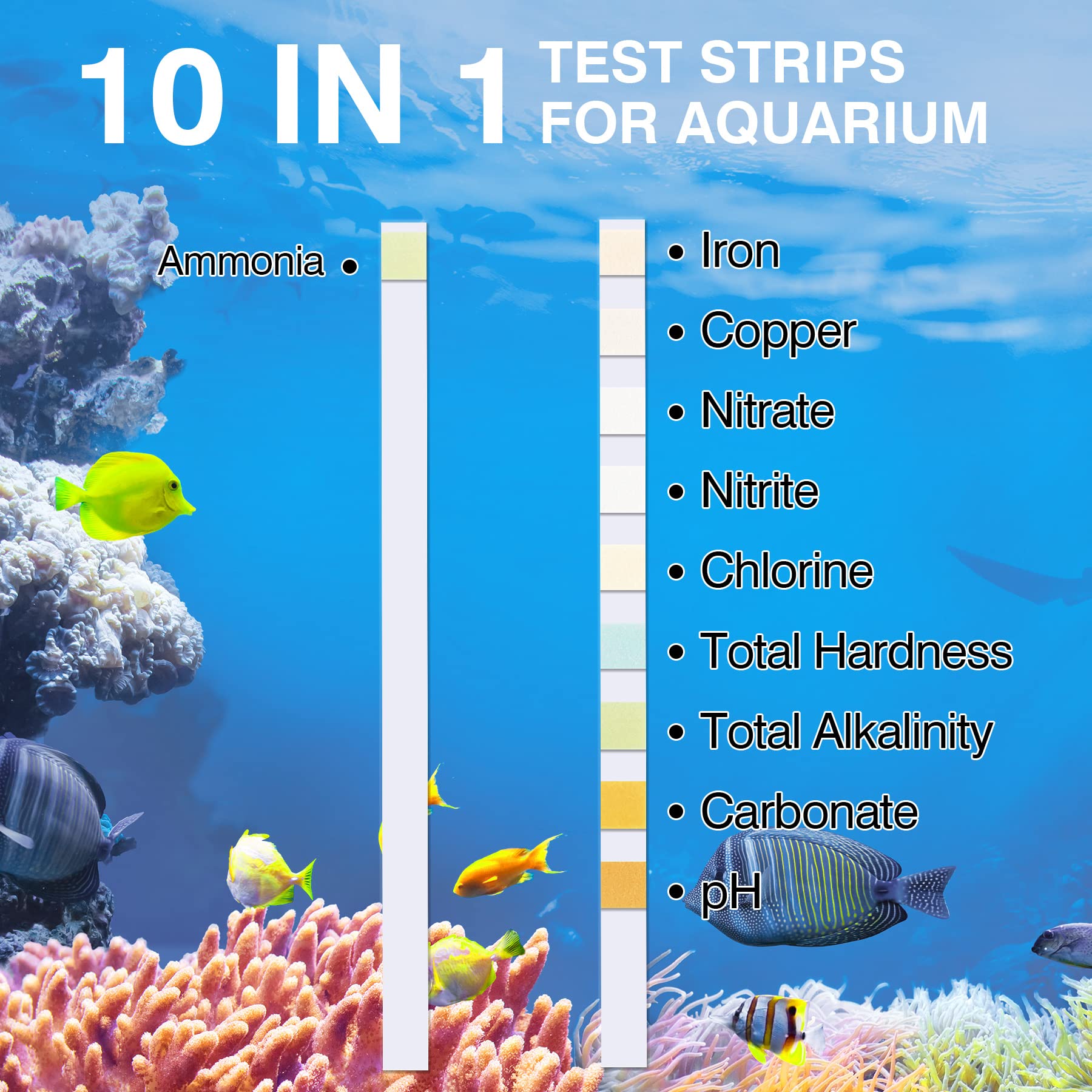 COMPLETE 10 PARAMETERS - Meet the most complete aquarium test kit, including 100 counts 9 in 1 aquarium water test stirps, and 50 counts ammonia testing strips. 10 parameters - Ammonia, Iron (Fe), Copper (Cu), Nitrate (NO3), Nitrite (NO2), Chlorine (Cl2), Total Hardness (GH), Total Alkalinity (TAL), Carbonate (KH), pH let you know aquarium water condition at a glance.