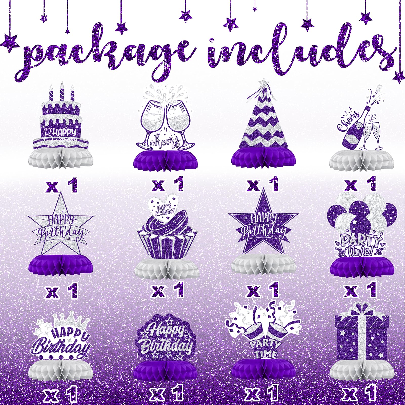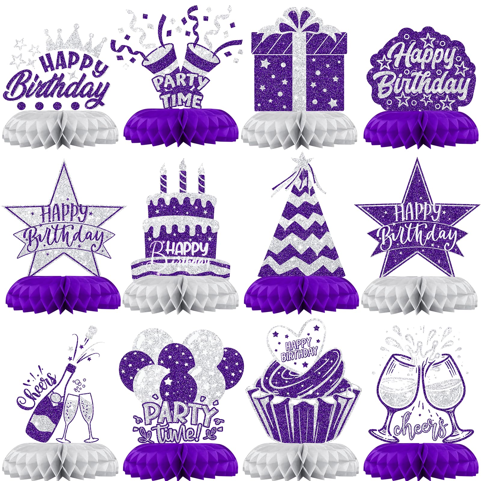 12PCS Happy Birthday Table Centerpieces – Includes 12 honeycomb pieces with cakes, stars, glasses, and balloons. Perfect for classy and fun birthday table decorations.