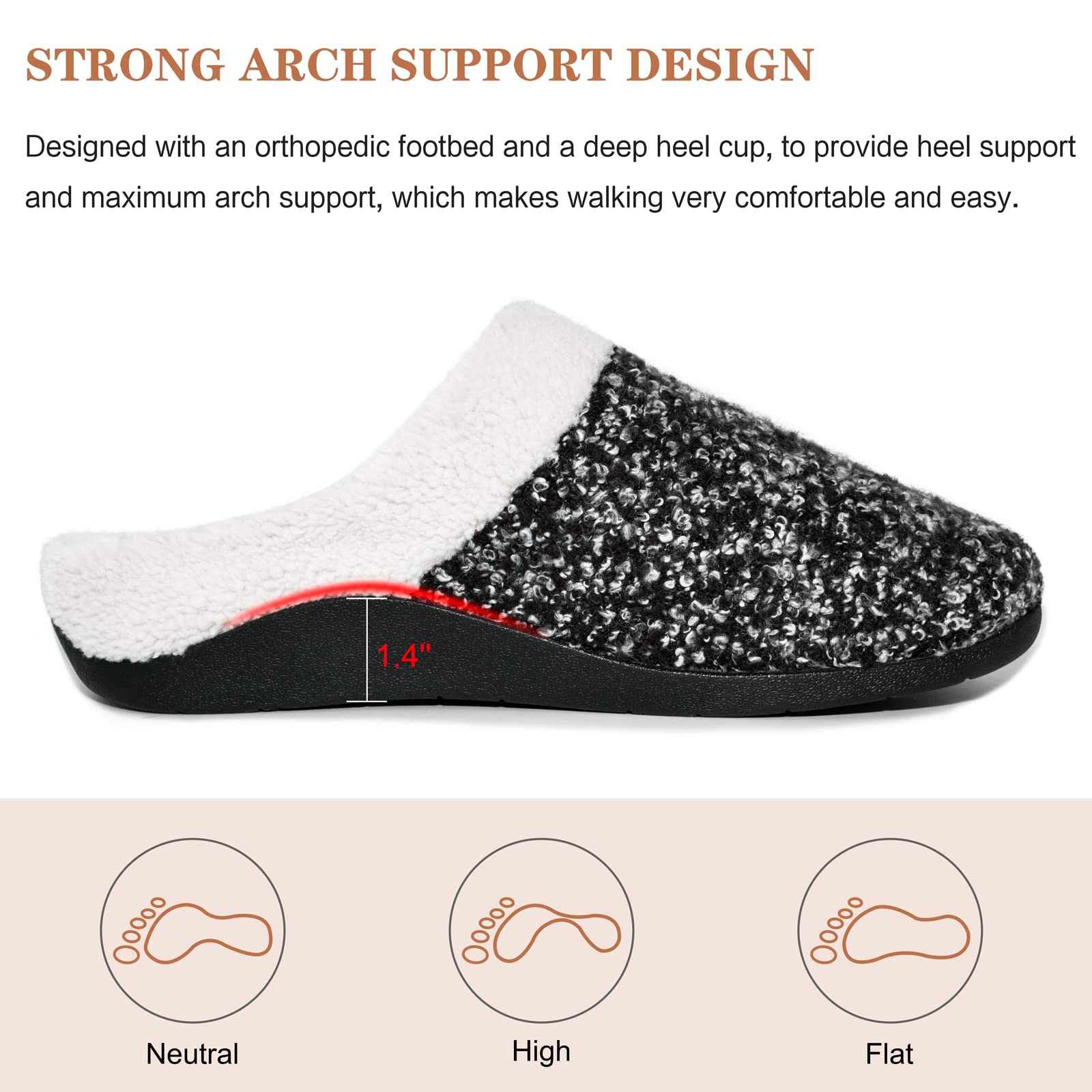 COZY AND WARM - These orthotic slippers are easy to slip on and off with low heel collar, and keep your toes warm and your feet cozy in winter, also help your feet to relax after a long day at the office, and the whole shoe relieves pain associated with Plantar Fasciitis.