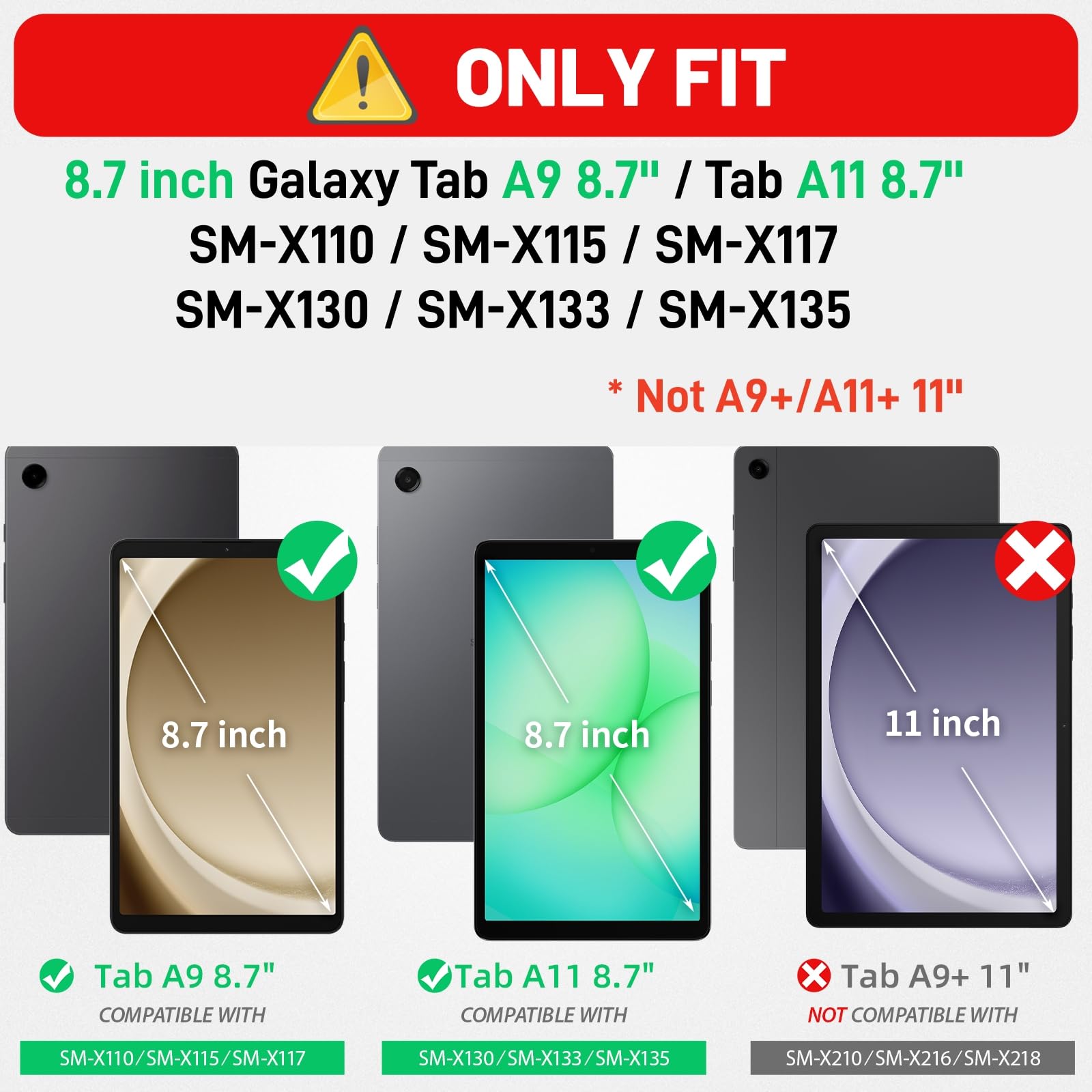 Compatible with 8.7 inch Samsung A11 & A9 tablet, not for other model size, Tap Settings - About tablet - Product name - Model Name (SM-X130 / SM-X133 / SM-X135 / SM-X110 / SM-X115 / SM-X117). *NO Pen * Easy to install and installation VIDEO available below.