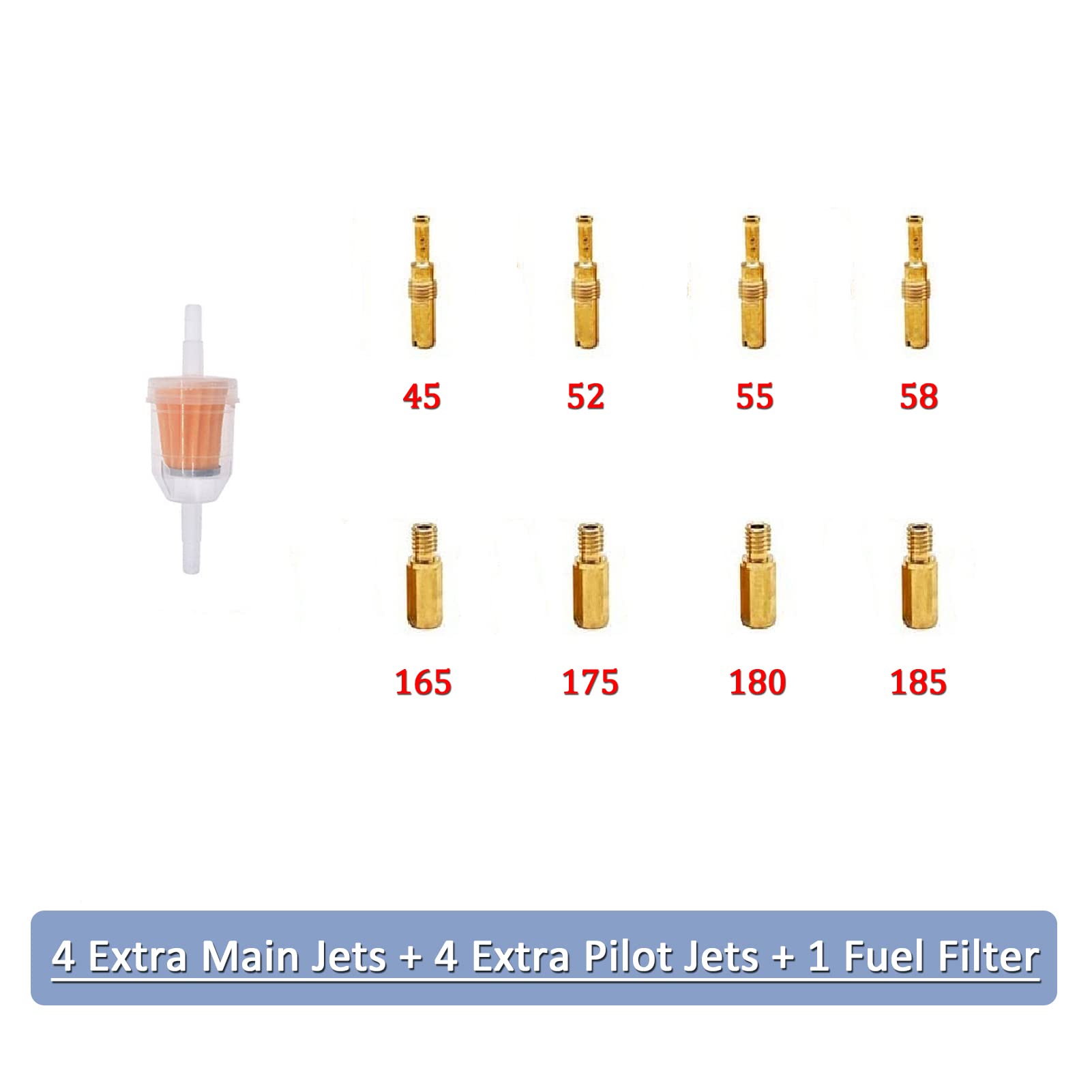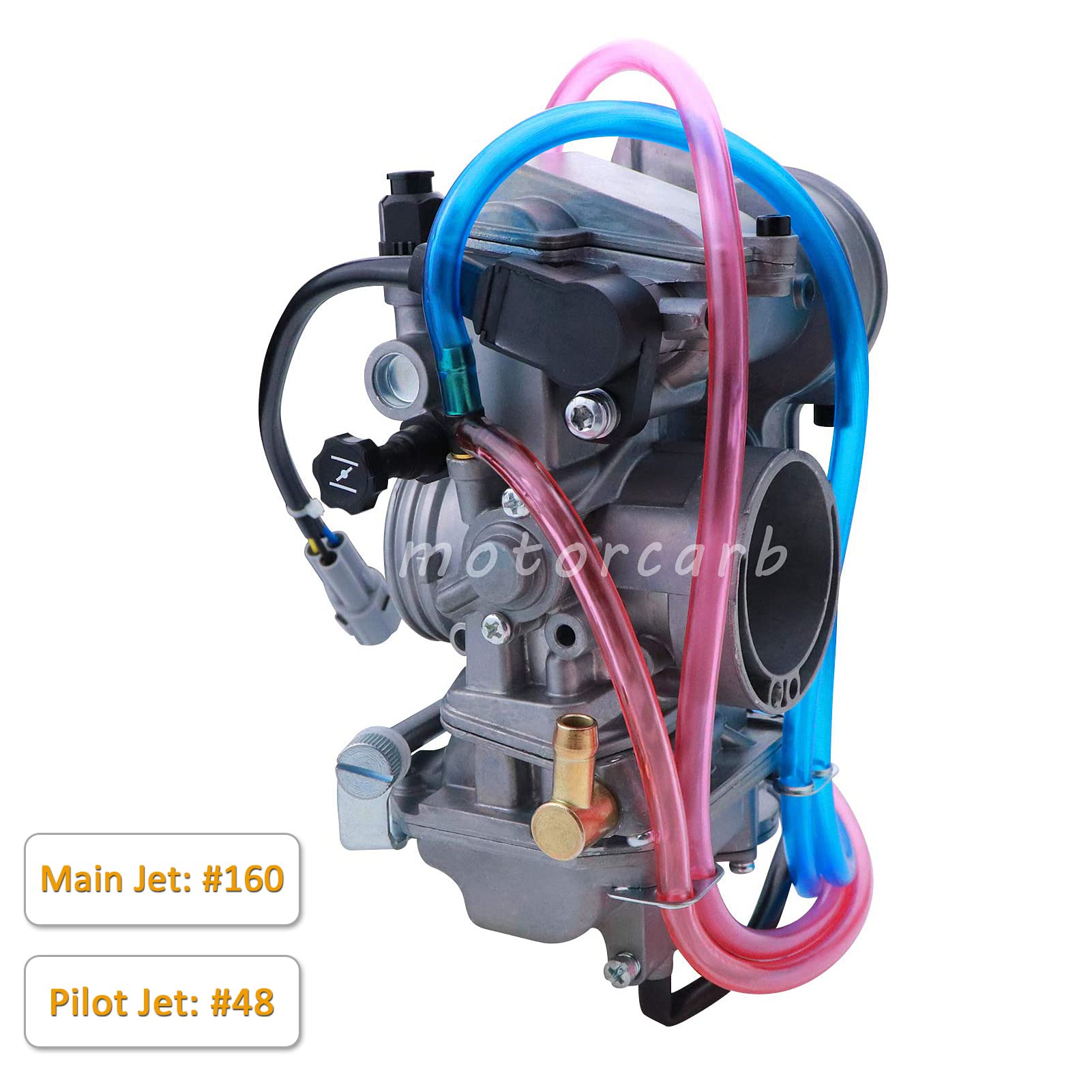 Main jet #160, pilot jet #48; Outlet I.D. 40mm/O.D. 50mm, inlet I.D. 44mm/O.D. 56mm; Package: fuel filter, 4 extra main jets, 4 extra pilot jets.
