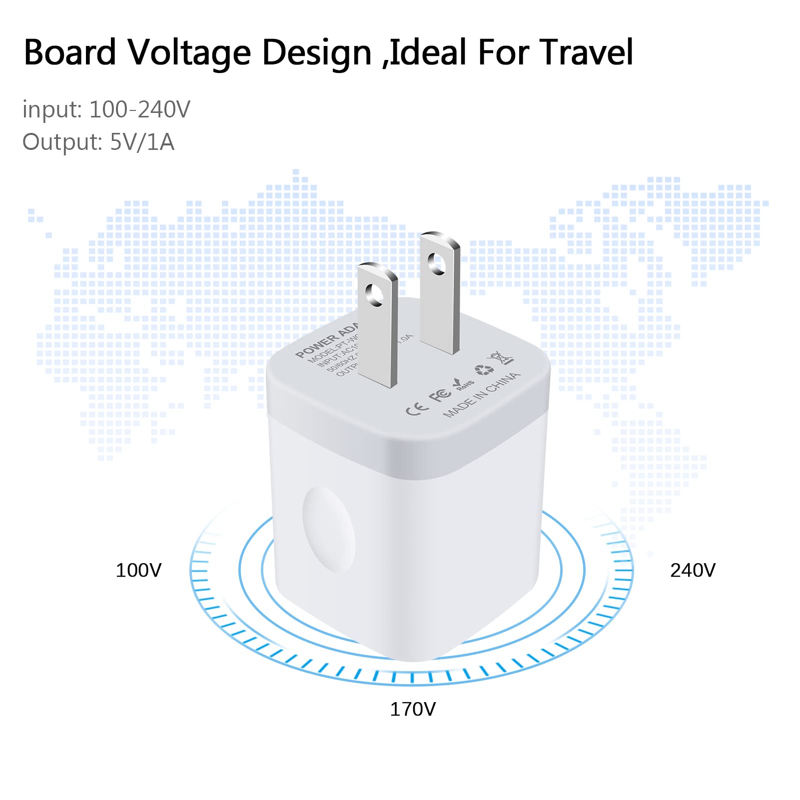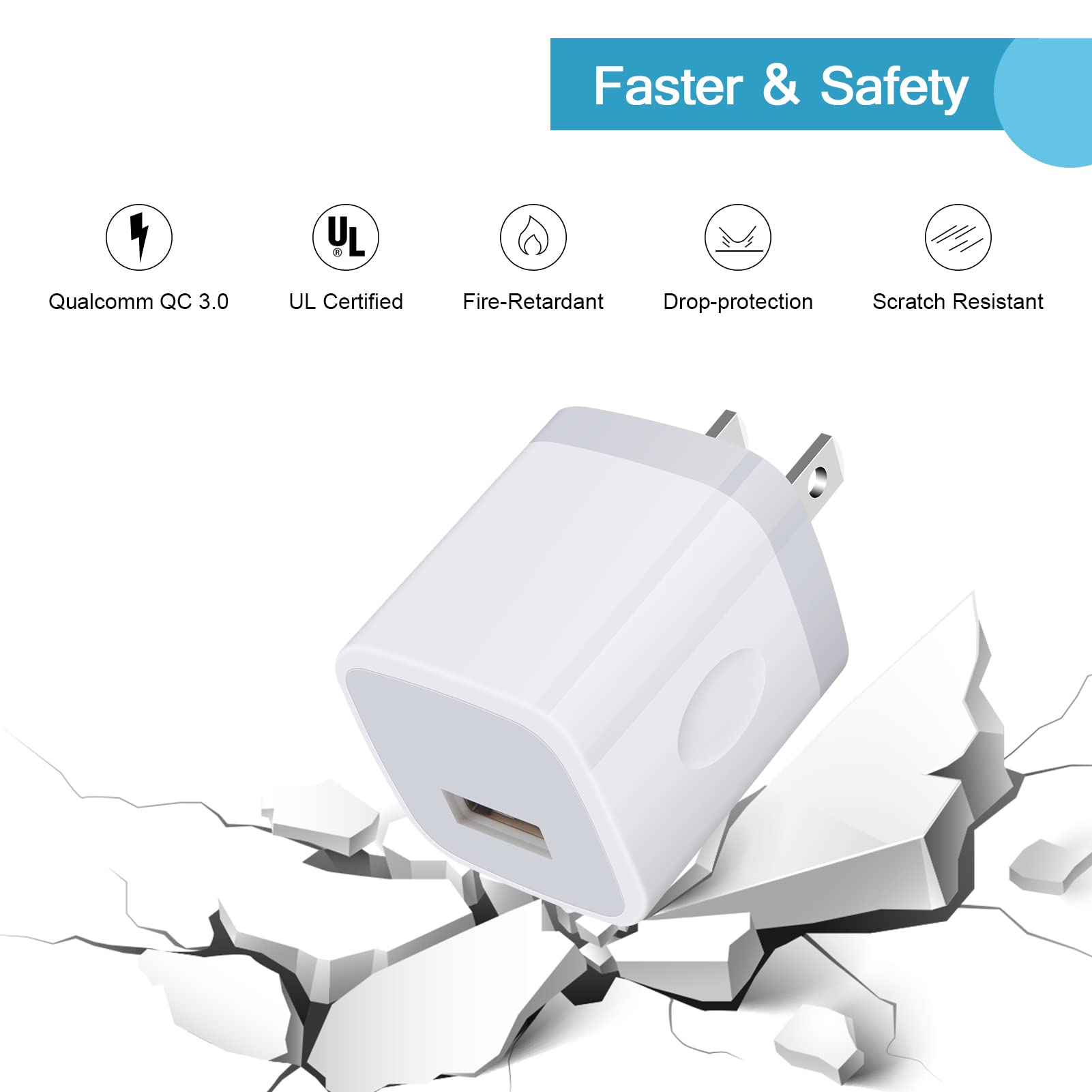 Safety Certified Charger Block : this usb block charging wall plug Certified by UL, FCC, CE, ROHS, and has a fuse-protective system to defeat extreme working condition, prevent Against to Overheating, Overcharging And Over Currents, and Short-Circuit Protection, this cube charge your Phone at a high speed ,5V/1amp charging box, 1.5 times faster than conventional phone charging plug