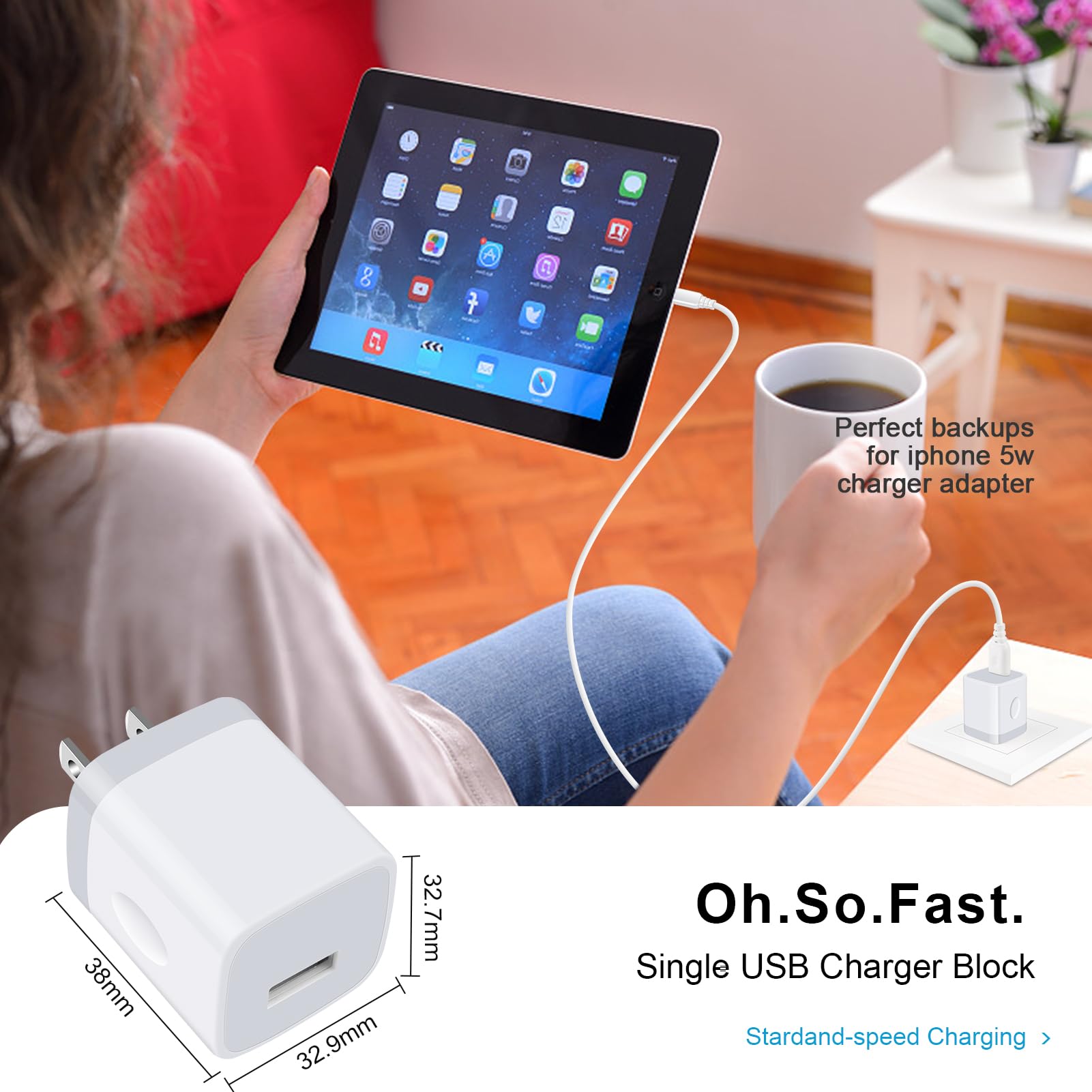 Compact for Travel Brick: Weight is 1.59 ounces, Dimensions 1.3*1.5*1.7 inches ,Robust Bright exterior resists wear, scuffing, and scratching, this so small phone charging brick make it easy to carry and store, you can charge at home or office, lightweight and compact size make it perfect for travel and easy plug in the wall outlet