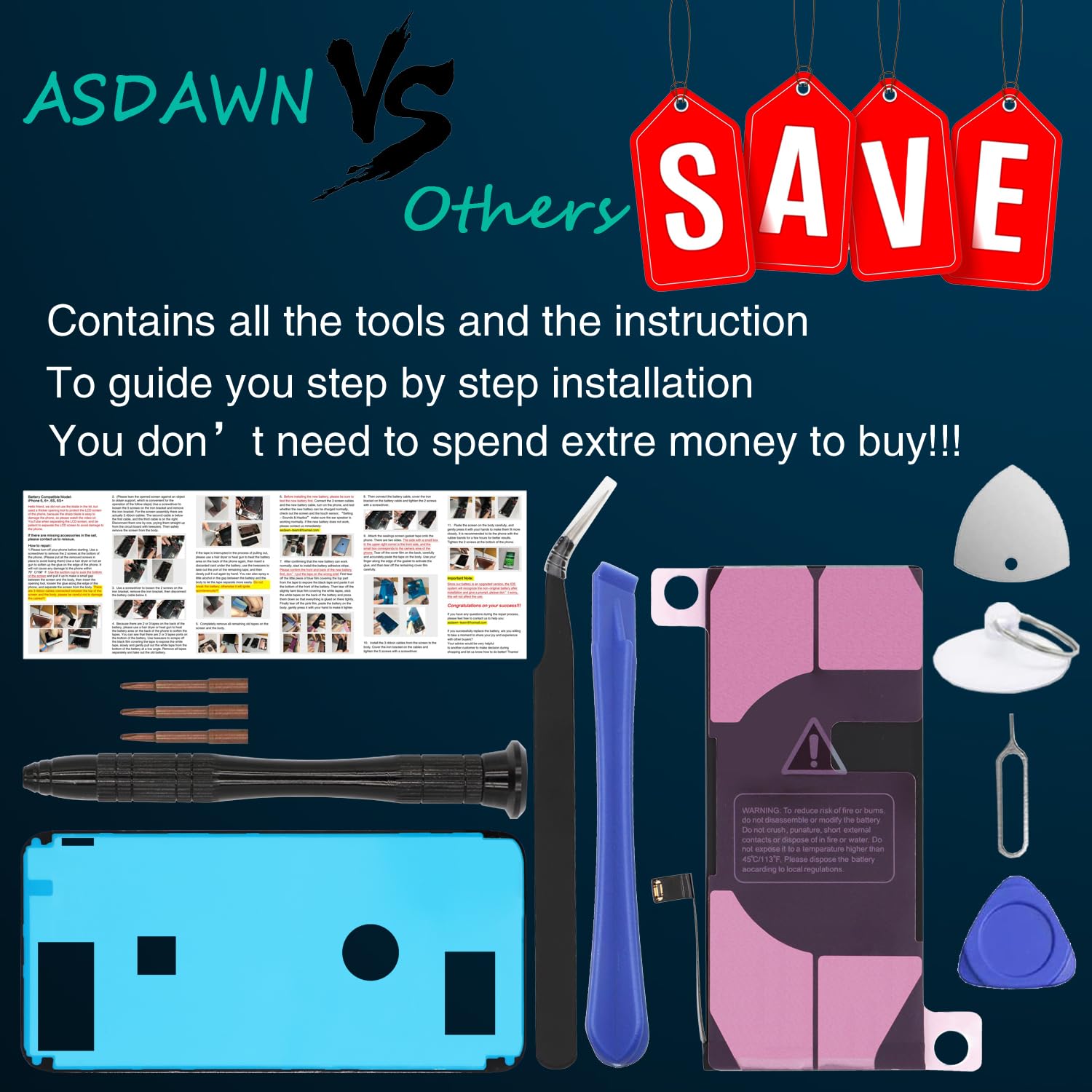 [BEST BATTERY PERFORMANCE] --- We do not hesitate to high cost, using the latest smart IC chips, excellent circuit boards, grade A+ rated battery cells on the market to manufacture this battery, offers good performance rate and high conversion, ensure longer battery life(1000 cycles) and high-speed, efficient charging. Up to more than 24 hours of long lasting time with normal use, and keep your iPhone going hours longer with heavy use. Bring your battery's life back to glory and save the money!