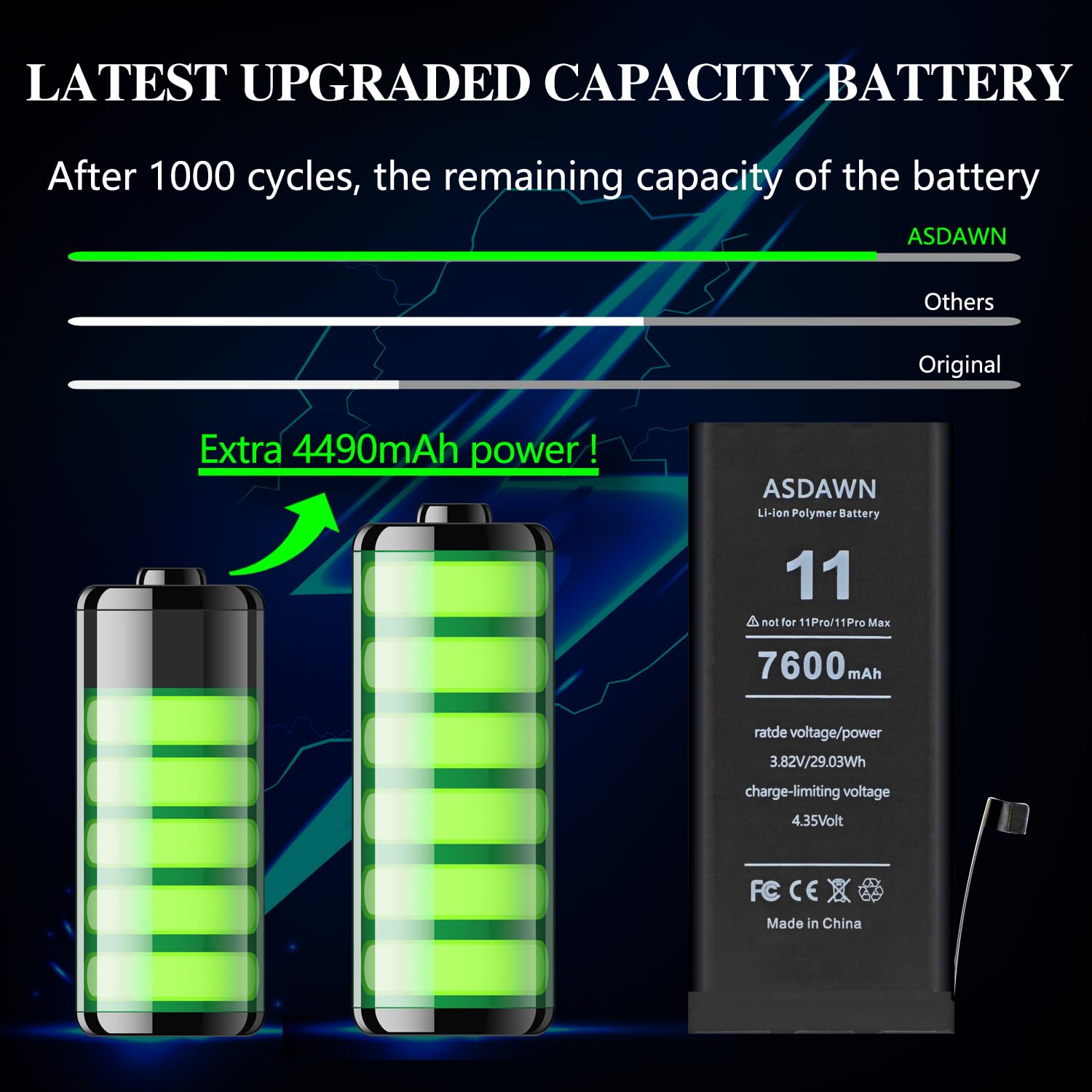 [HIGH CAPACITY BATTERY] --- Our iphone 11 replacement battery is made of high quality li-ion polymer battery cell, the advanced technology makes this 11 battery capacity up to 7600mAh, more power than standard 4490mAh battery, up to 1000 highly efficient charge cycles are available. Brand new 0 cycle battery cell capacity is upgraded to store more power, bring more standby time, increasing battery life and and reduce your recharging times. Same charging time but more use time!