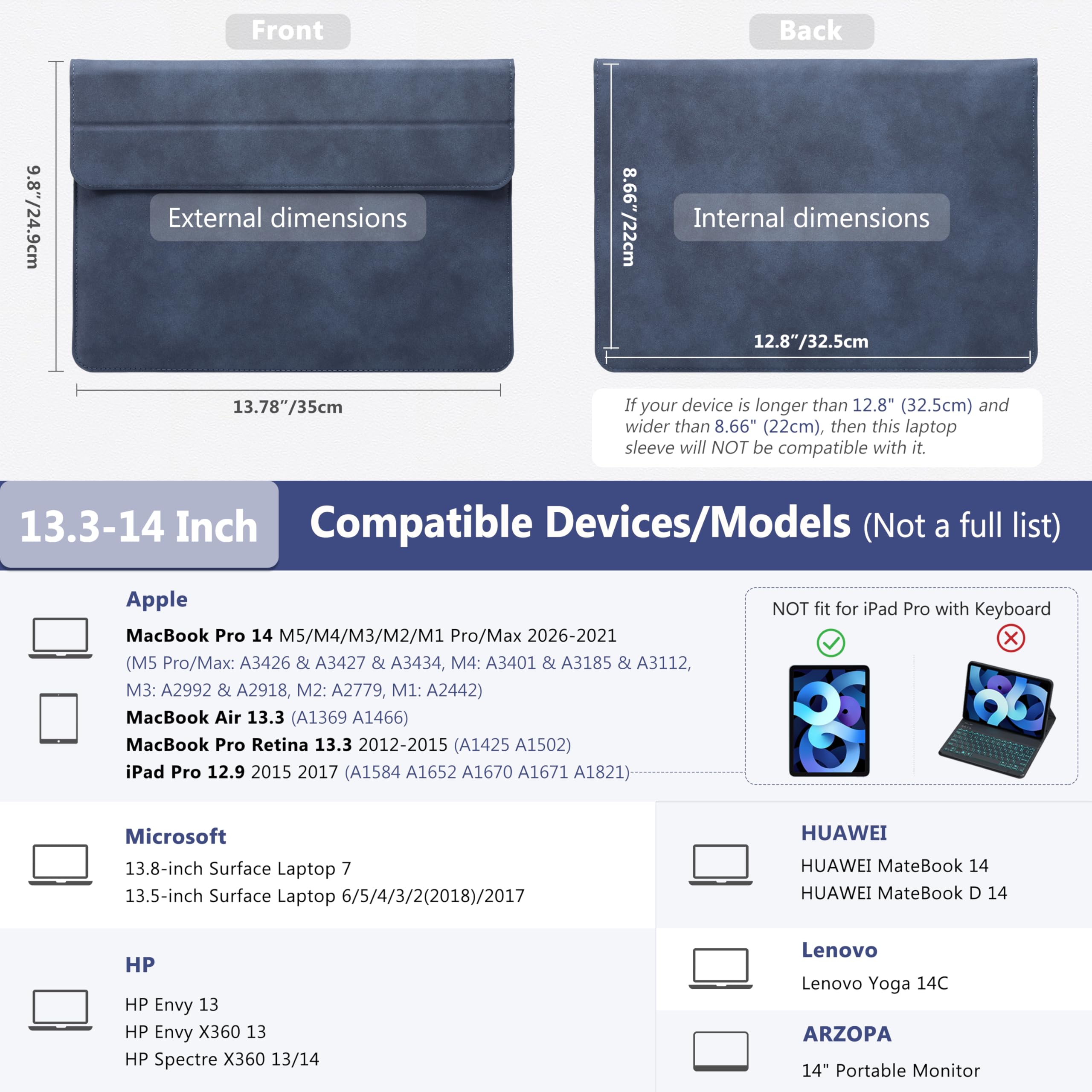 Internal Dimensions: 12.8" x 8.66" (32.5 cm x 22 cm). Compatible with 2026-2021 MacBook Pro 14 M5/M4/M3/M2/M1 Pro/Max (A3426, A3427, A3434, A3401, A3185, A3112, A2992, A2918, A2779, A2442), 13.8"/13.5" Surface Laptop 7/6/5/4/3/2 (2018)/2017, MacBook Air 13 2012-2017(A1369, A1466), MacBook Pro 13 2012-2015(A1425, A1502), iPad Pro 12.9-inch 2nd/1st Gen. 2017 2015, HP Envy 13, HP Envy X360 13, HP Spectre X360 13/14, Huawei MateBook 14, Lenovo Yoga 14C, Lenovo Yoga 720/910/920, etc.