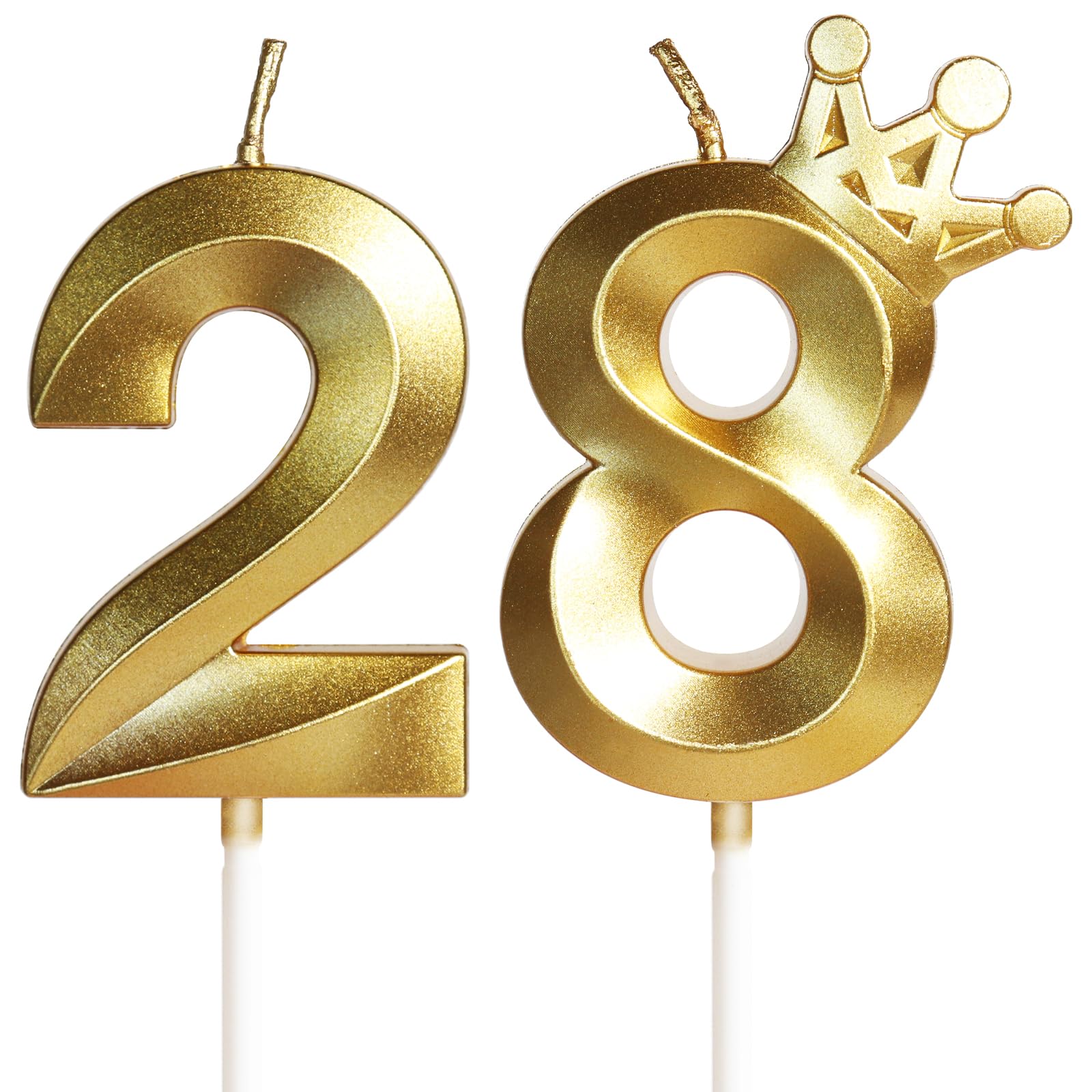 28th Birthday Candles for Cake, Number 28 Gold Candles with Crown, 3D Design Birthday Cake Topper for Women Men Birthday Party Wedding Anniversary Celebration Decorations Supplies Features: 3D Delicate appearance: The happy birthday cake candles are meaningful for you to celebrate your birthday and nice cake topper decoration for embellishing your cake and cupcake,creating romantic atmosphere and adding a touch of elegant. Adapt to the venue: Ideal cake decoration for many occasions, such as birthdays, pet birthdays, baby showers, anniversaries, retirement parties, family reunions, weddings, Hawaiian parties, even Christmas, must-have items for party cake, bring you memorable and meaningful party. Specifications: Quantity: 2 piece Material: wax, plastic Candle length: approx. 5 cm/ 1.97 inch Total length: approx. 11.5 cm/ 4.5 inch Color: as pictures shown Package includes: 1 x Number 2 and 8 Gold Crown Birthday Candles