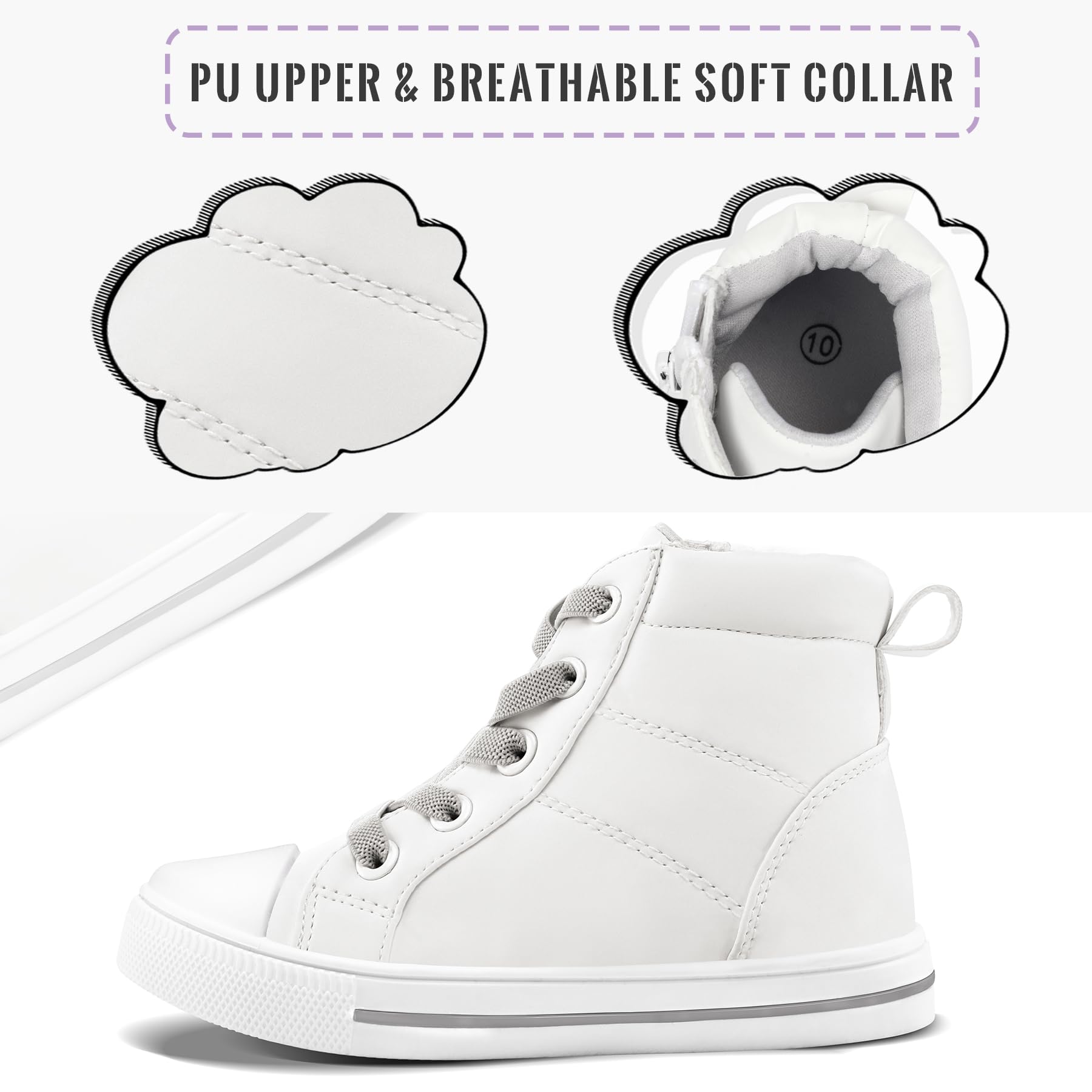 Super comfortable:Our high top sneakers have a padded collar to prevent children's heels from being hurt by the shoes. The soft insoles and comfortable collars provide comfort in every way, all for the sake of children's comfort.