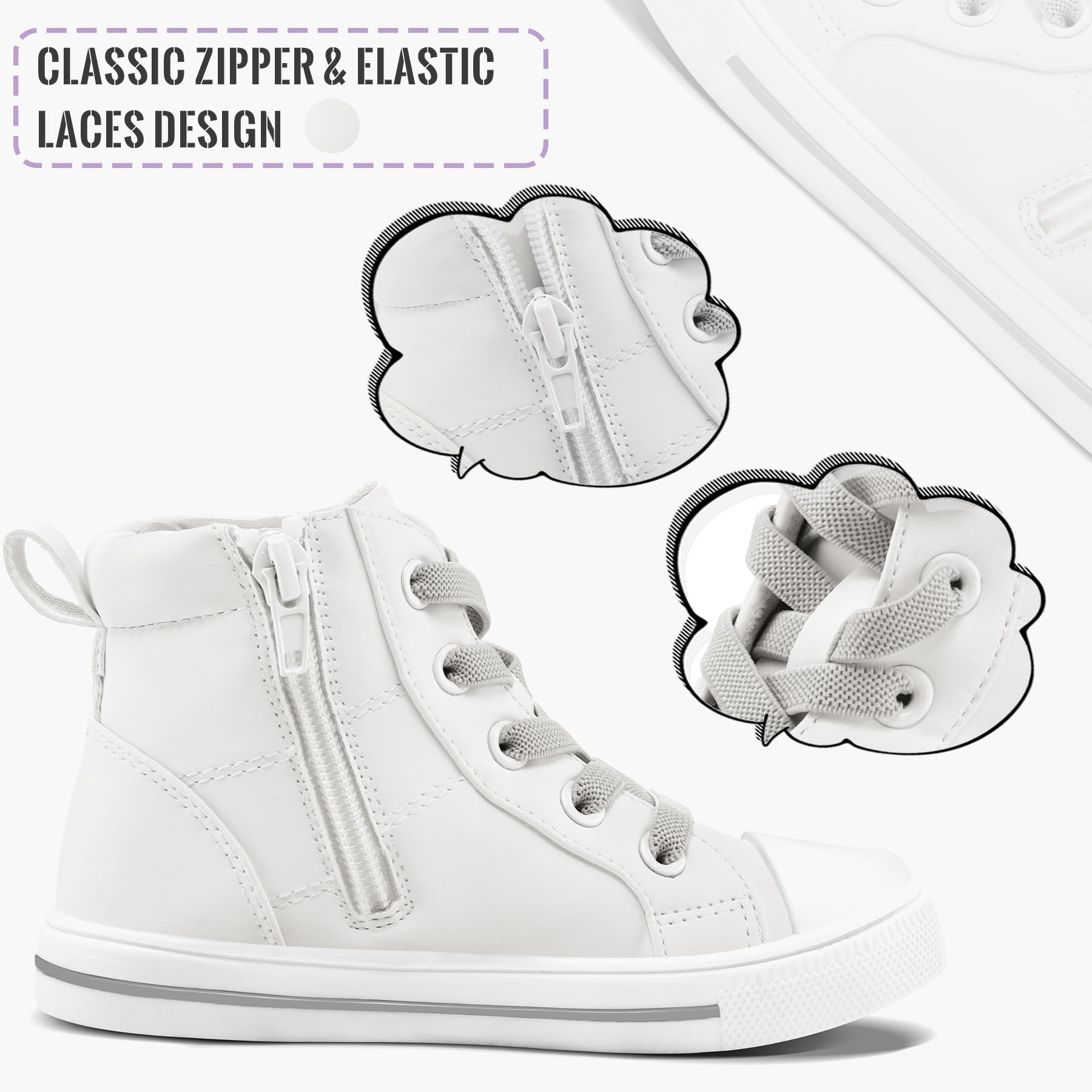 Easy on & Off:Our kids high top sneakers use a zipper closure design, children do not need to tie the laces which is much easier to put on and take off by themselves, and the elastic lace design makes the shoes fitter to the children's little feet.