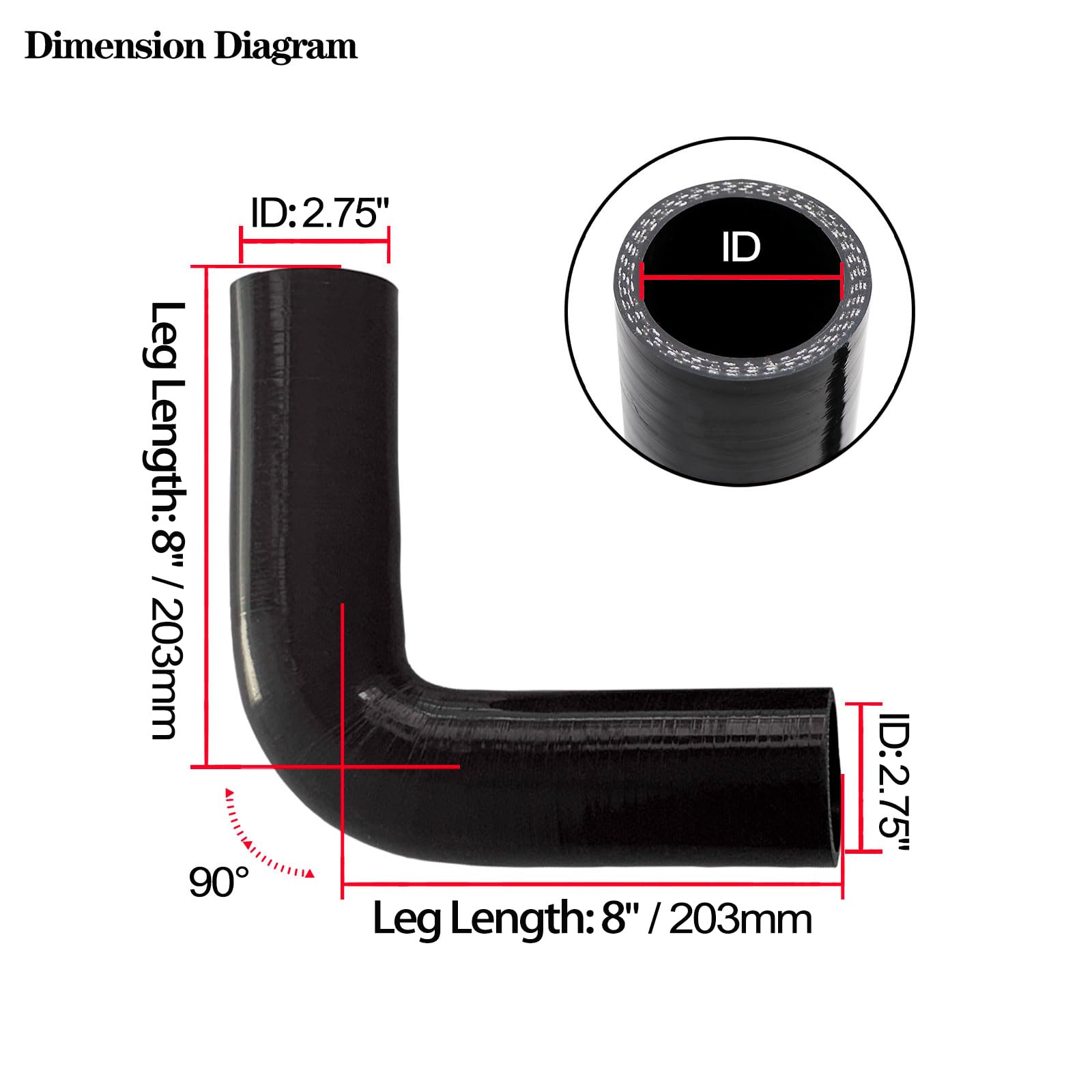 SIZE: 90 Degree silicone elbow size is 2.75 inch (70mm). Leg Length: 8 inch (203mm). Wall Thickness: 0.2 inch (5mm).