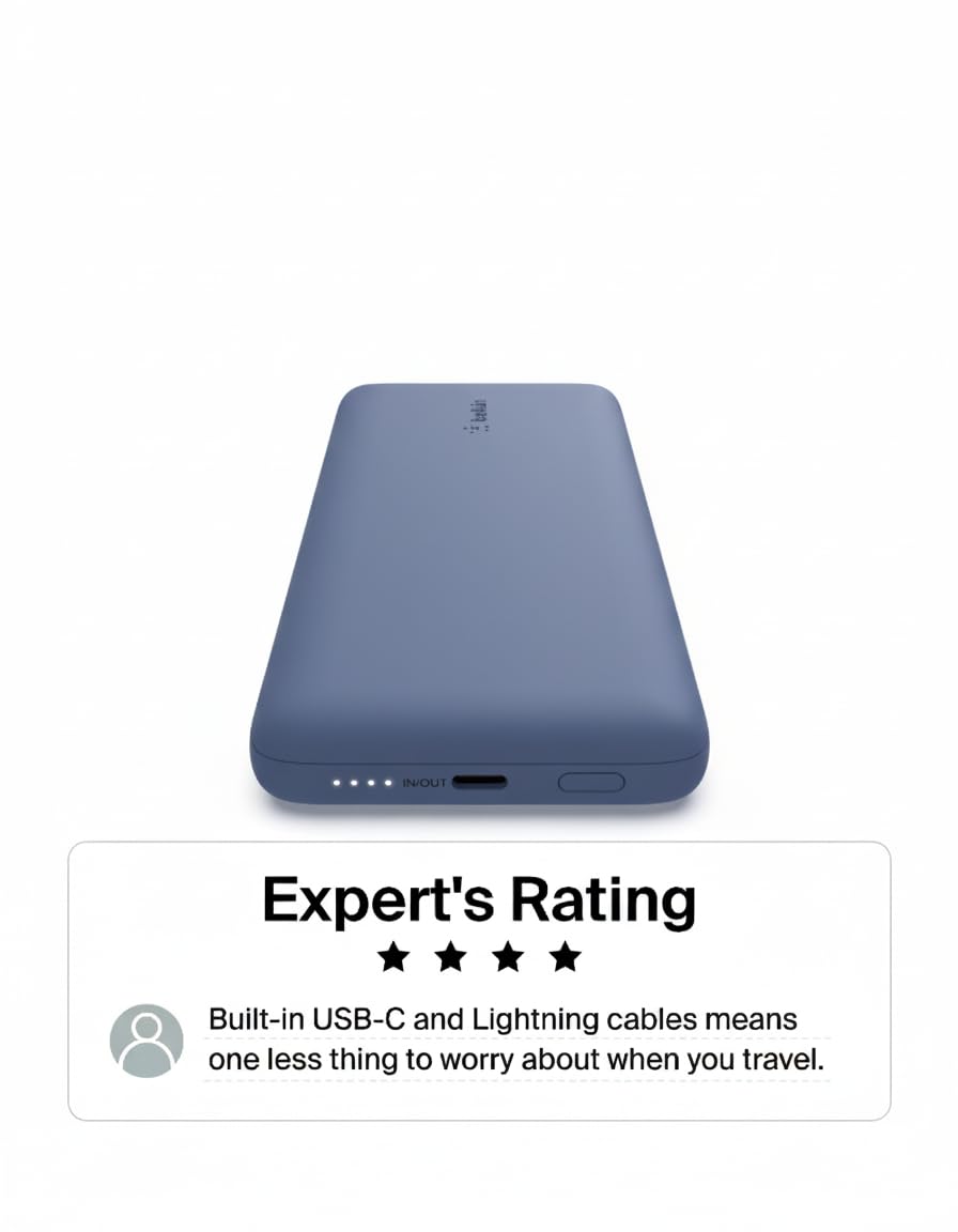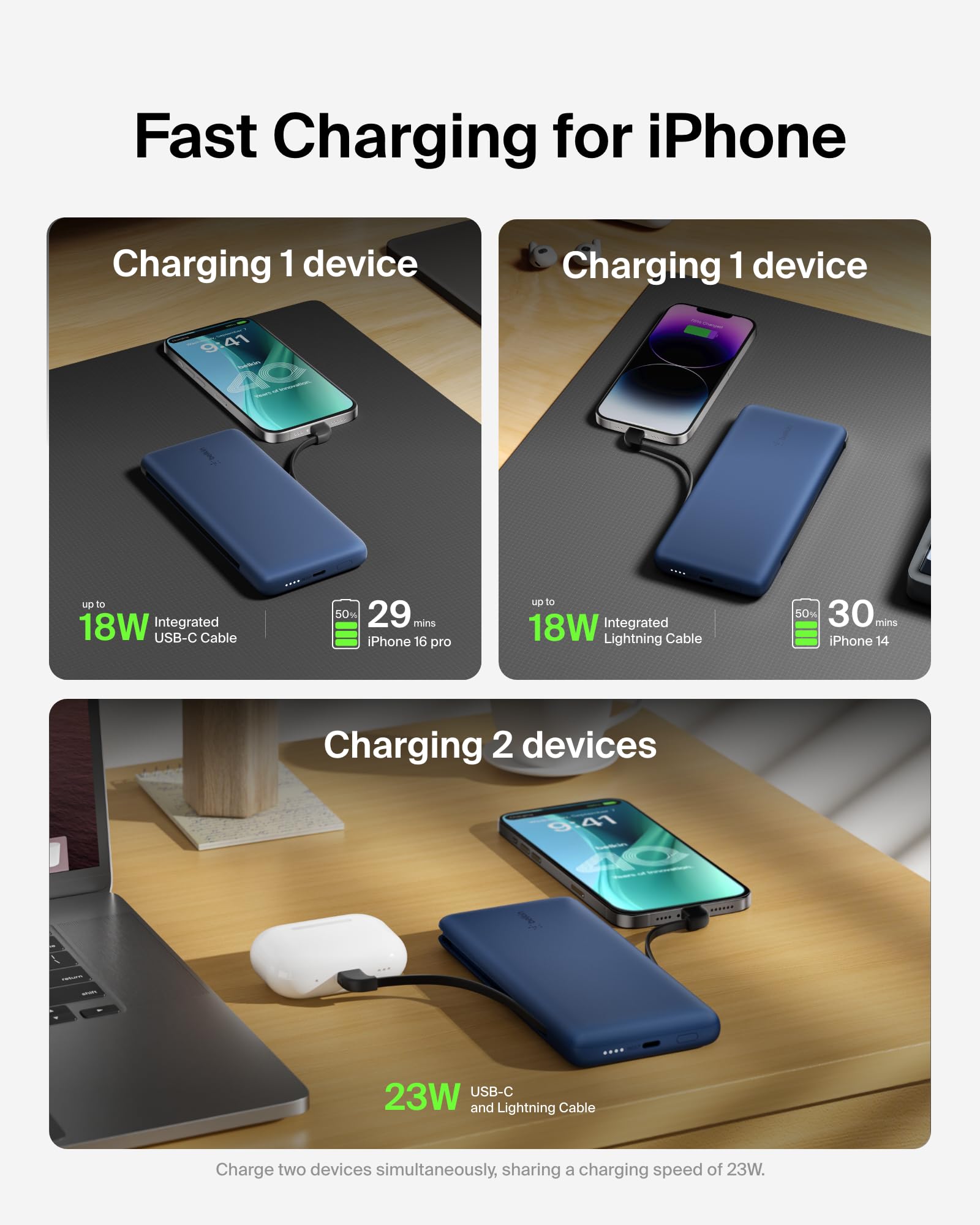 The Belkin BoostCharge Plus Portable Charger Power Bank is the perfect way to charge your smartphones and tablets on-the-go. This 10k mAh portable charger features a built-in lightning cable (MFi) and USB-C cable so you can recharge your devices without having to worry about separate cables. Belkin BoostCharge Plus also supports pass-through charging*, which allows you to charge both your power bank and connected device at the same time with up to 18W. With a super high capacity of 10,000 mAh, the battery pack can keep your devices charged all day. And you will always know when your power bank needs to be charged, with the onboard LED indicator light quickly and easily displaying the battery status of your portable charger. *Pass-through charging of the portable charger is supported when the power bank is above 25% charge. **Maximum additional video playback hours calculated by comparing the mAh capacity of this power bank with the maximum video playback hours achievable by the iPhone 12 under normal conditions. Actual results will vary depending on differing factors for individual users. Specifications: Dimensions: 2.9” x 6.1” x 0.7” Weight: 0.5 lbs. Compatibility: Apple iPhone 17 Series, iPhone 16 Series, iPhone 15 Series, iPhone 14 Series, Samsung Galaxy S25 Series, Galaxy S24 Series, Galaxy S23 Series, Google Pixel, iPad Pro, Tablet, MacBook Pro, and more