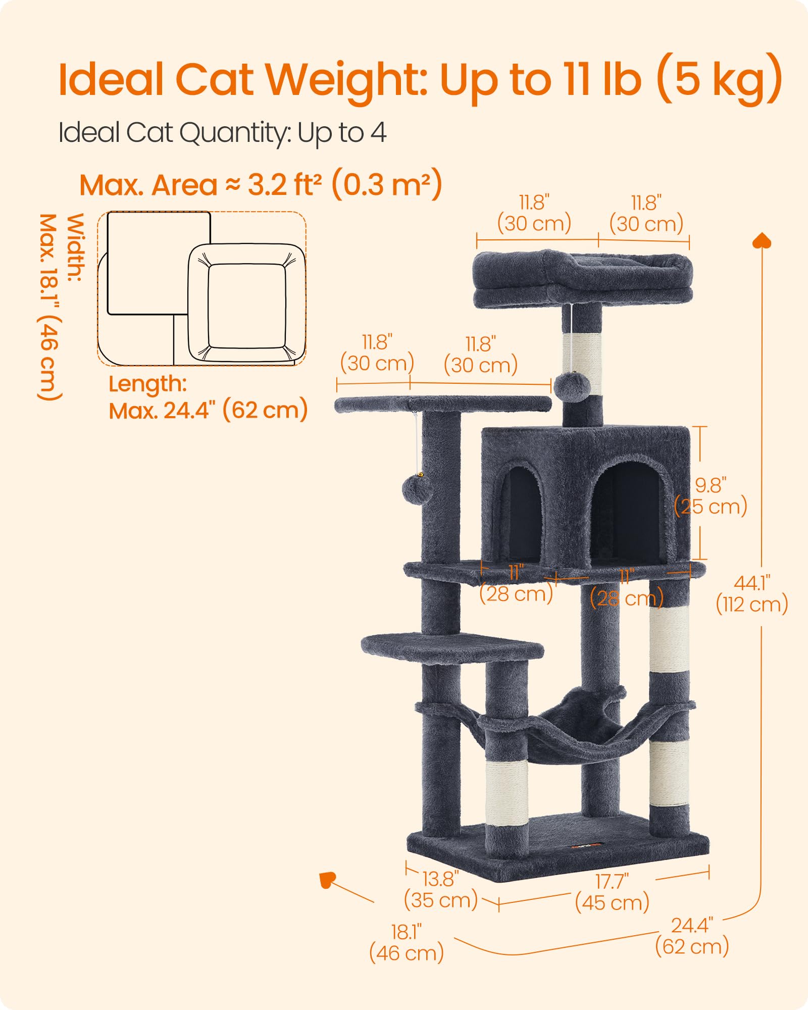 For Multi-Cat Households: Featuring 2 top perches and a comfy cat cave, this cat tree offers multiple cozy places for each of your little furballs to nap and relax