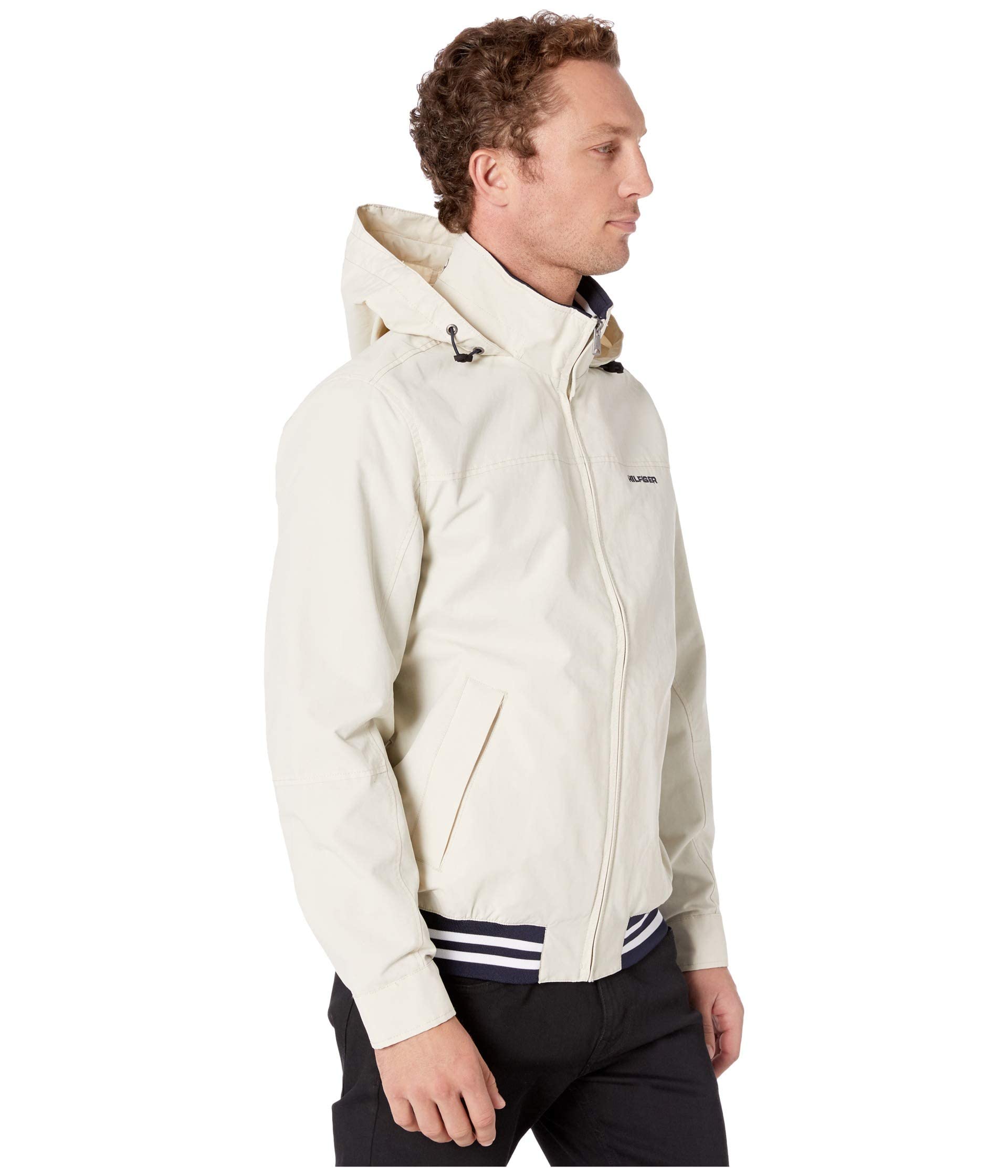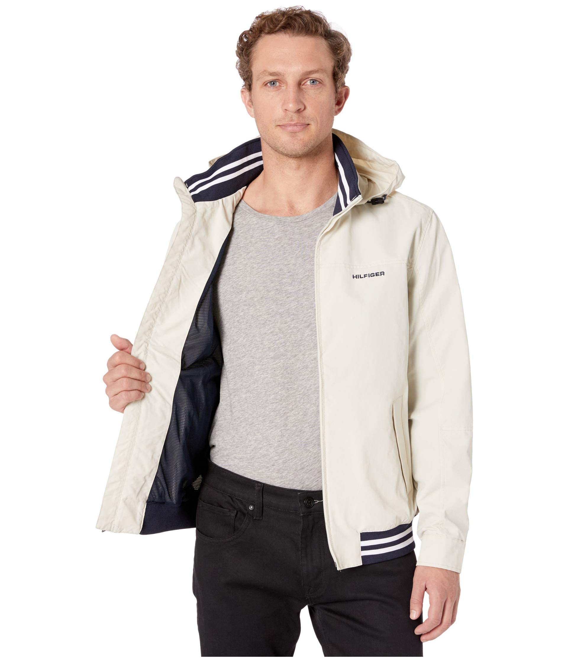 Description Layer up in this men's jacket from Tommy Hilfiger when the weather calls for added protection. Lightweight and waterproof. Zip front closure. Mock collar with packable hood. Slight waist open pockets; interior pocket with hook-and-loop closure.
