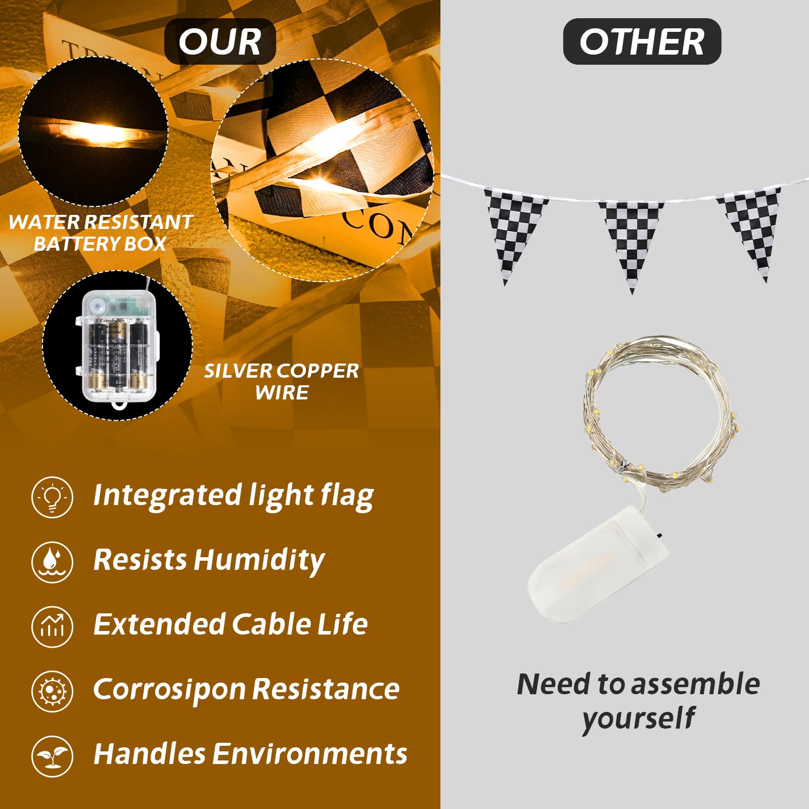 Light up Checkered Flag Banner: the checkered flag banner come with warm string light, the integrated design save the hassle of wrapping the string light with the banner, easy to set up and can be DIY according to your need, this banner will make your party preparation a breeze