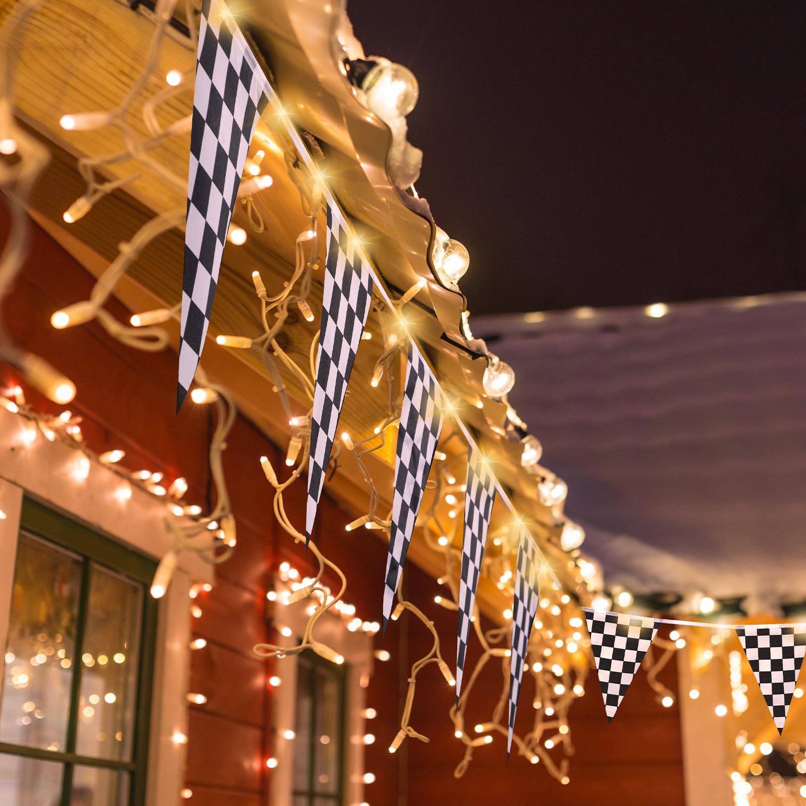 Waterproof for Outdoor Use: the waterproof feature, facilitated by the plastic banner and waterproof battery case of the string light, allows for carefree outdoor decorations regardless of weather conditions; You can hang the checkered black and white flag on trees, tables, walls, fences, porch, doors and so on