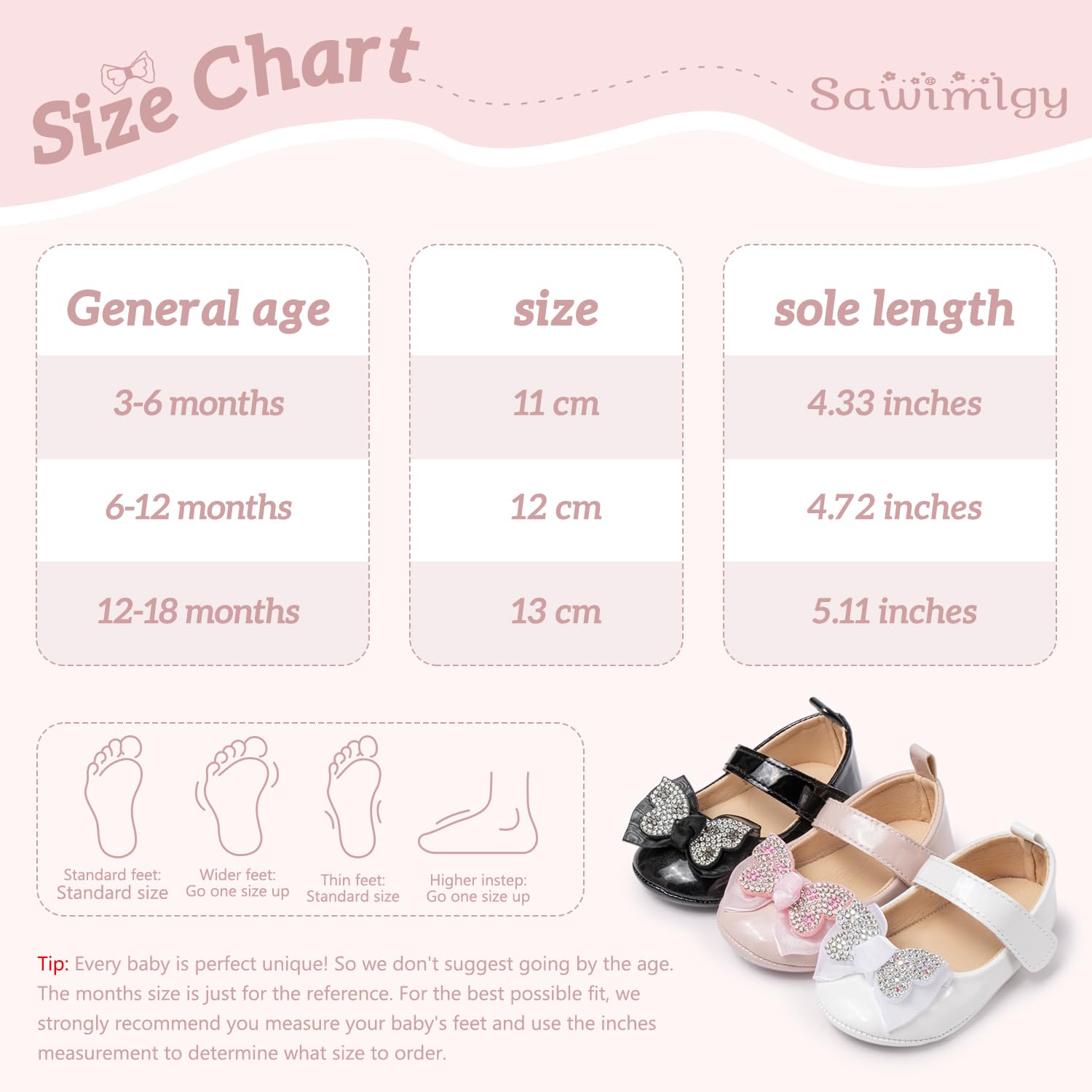 Size Tips: We provide general age recommendations for each of our sizes, but every baby is the unique. So we don't suggest you just going by the age. Please measure baby's actual foot length to choose the best fit shoe. If your little girl have a wider feet, please buy it size larger. Thanks