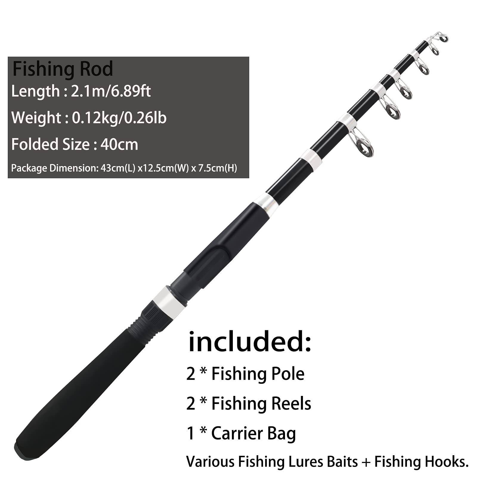 【2PCS Fishing Pole Full Kit】included:2PCS Carbon Fiber Fishing Pole + 2PCS Spinning Fishing Reels + Carrier Bag + Various Fishing Lures Baits + Fishing Hooks.