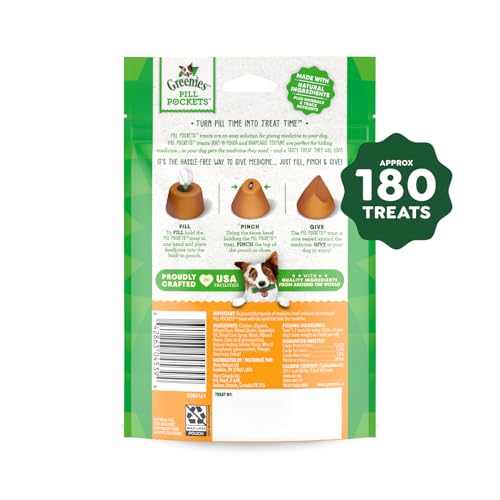 Greenies Pill Pockets turn pill time into treat time, they simplify pill giving. These pill pouches for dogs let dog parents and pet owners provide pill administration without messy peanut butter or cheese. Created by veterinarians, the healthy pouch, made with natural flavor masking ingredients plus trace nutrients, masks smell and taste so medication delivery stays stress-free in your daily medication routine at home. Suitable for large or small breeds to encourage voluntary ingestion, this capsule-size formula helps pet parents maintain health and dog wellness through easy medication administration while keeping paws clean. It reduces medication refusal, simply drop the tablet into the pouch, pinch, offer, and watch it vanish--administering medicine with this pill mask never felt so rewarding. Data on file at Mars Petcare US, Inc. 2018