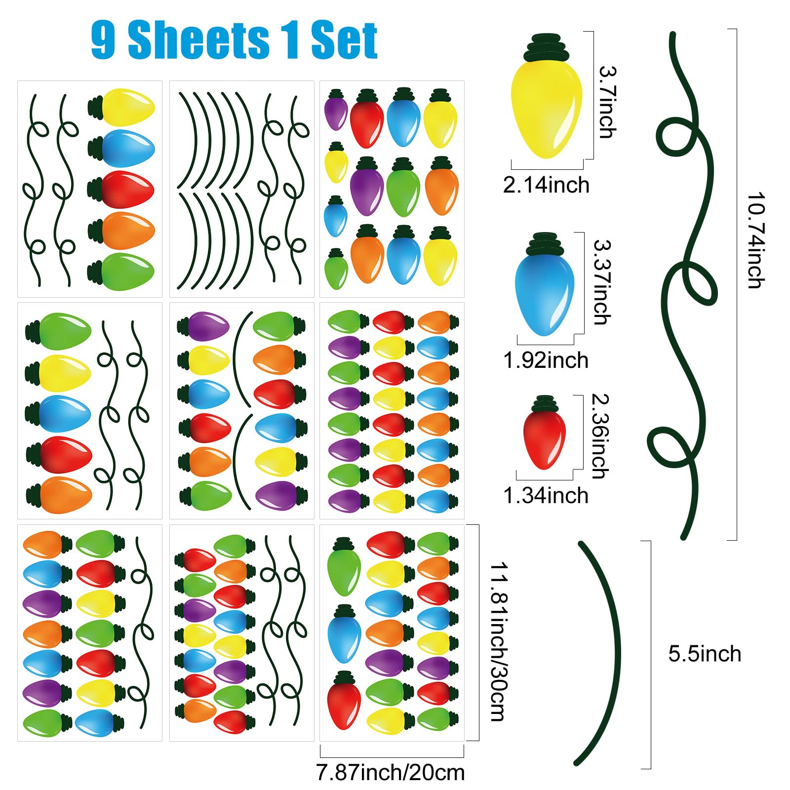Unique designs: 9 sheets of Christmas winter decals for windows are designed with different patterns and colors, each sheet measures 20 x 30cm / 7.8 x 11.8inch, printed with bulb light and wire, well match the Christmas season atmosphere