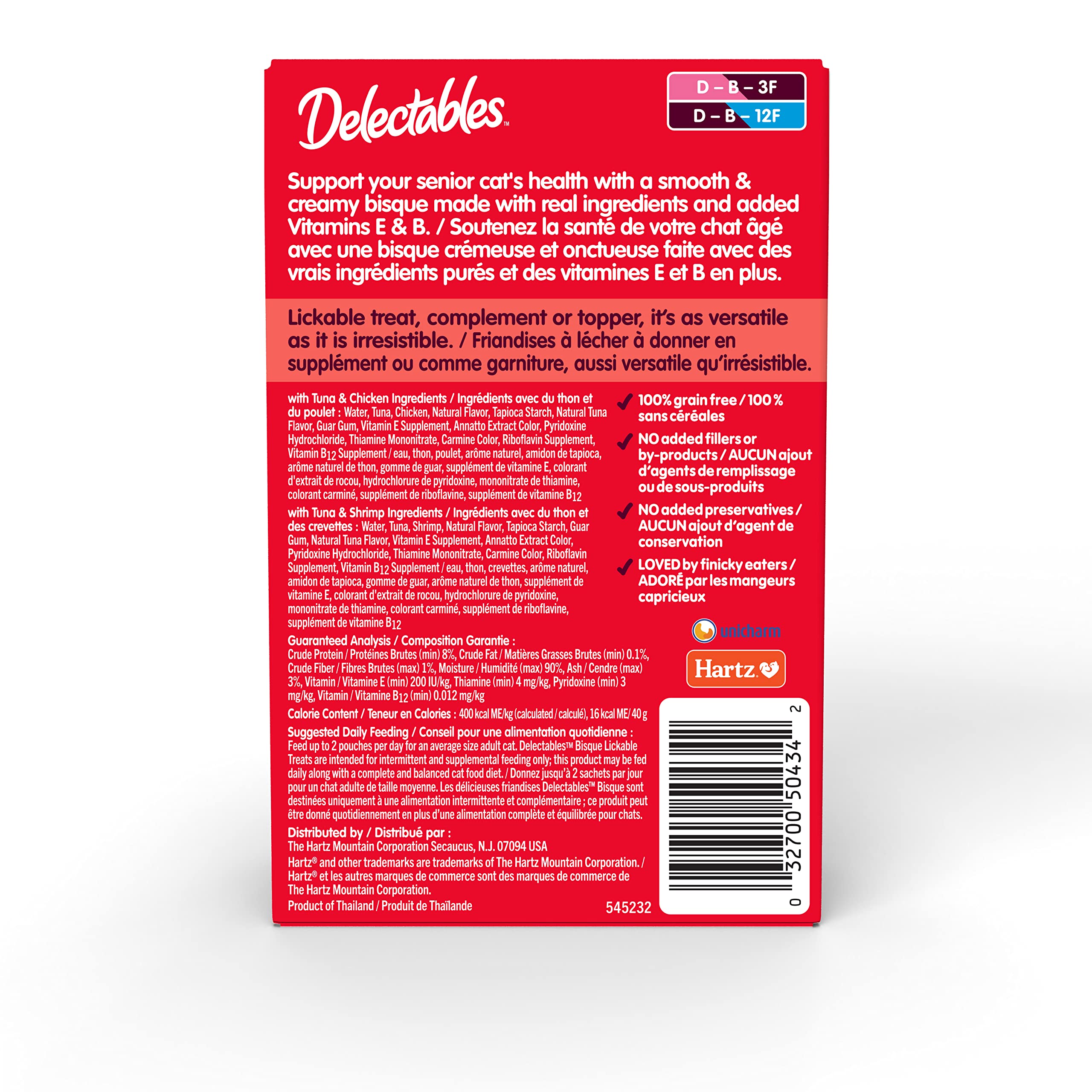 Each Delectables Lickable Treats pack includes 36 – 1.4-ounce pouches, 18 tuna & chicken and 18 tuna & shrimp