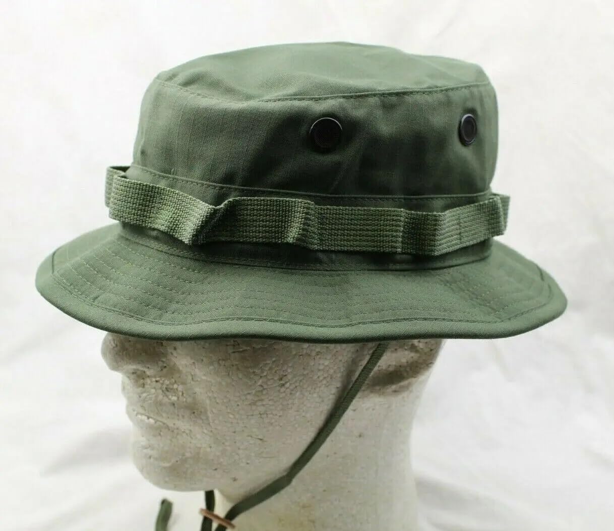 Description The Vietnam Short-Brim Olive Drab Boonie Hat was designed for military use in hot, tropical settings. It has evolved into a popular choice for various outdoor activities. Made from a durable cotton-nylon blend, it features a unique 2-inch brim, shorter than standard boonie hats, for improved visibility. This modification, rooted in the Vietnam era, aimed at enhancing sight lines for better task performance. The hat includes branch loops for camouflage, an adjustable chin strap for a secure fit, and ventilation for breathability. Originating in military contexts, its functionality and adaptability have made it a favorite among those engaged in fishing, hunting, hiking, and backpacking. Made in the USA to military specifications, it represents a blend of tradition and practicality, embodying the utility and historical significance of military attire in outdoor and recreational settings.