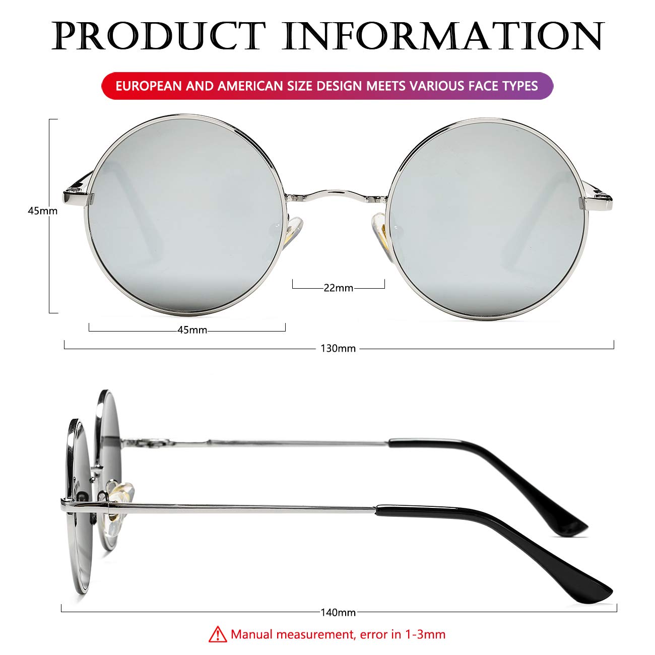 STAINLESS STEEL METAL MATERIAL ►This round sunglasses is made of ultra-pure stainless steel materials, so the frame is very thick, and very strong. The classic design makes men and women polarized sunglasses suitable for almost all face types, let you wear will feel very comfortable and there will be no pressure on your nose.