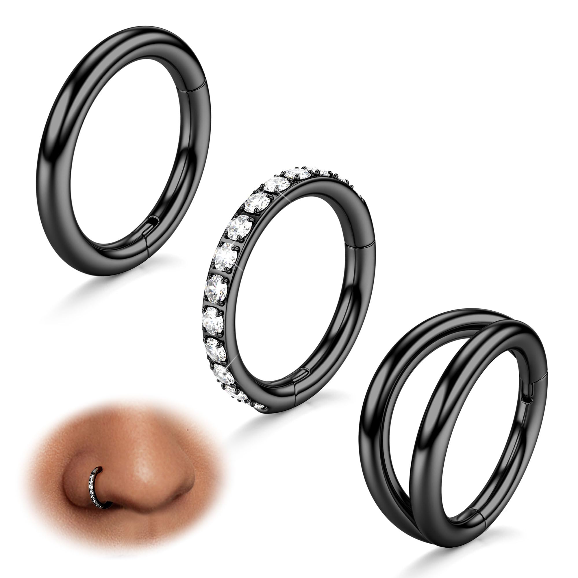 Seamless Black Plated Nose Ring Hoop: Gauge size: 14G(1.6mm); Inner diameter: 9mm(0.35 inches); Material: 316L stainless steel; One order includes 3 piece of hinged segment ring, comes in various styles to meet your fashion needs: sparkly CZ nose hoop, double hoop nose ring, dainty single septum hoop;We've provided the size comparison chart for you reference