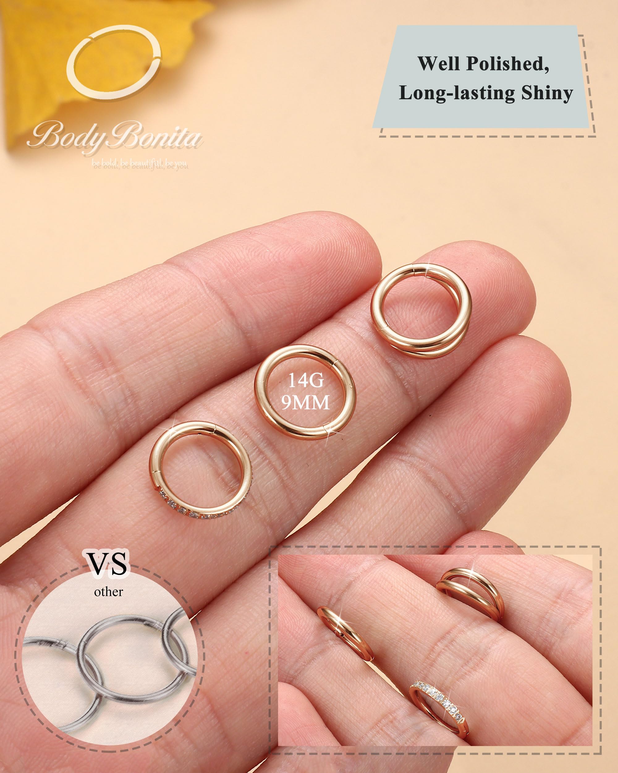 Description What you get: 3 pcs of BodyBonita seamless nose ring(14K gold plated/silver/black plated/rose gold plated ), crafted to be brilliantly shiny, hypoallergenic, and effortlessly easy to put in and take out. Materials: 316L stainless steel. Style in One Package: cubic zirconia nose hoop, double nose ring hoop, classic single nose rings hoop. Available Color: 14K gold plated/silver/black plated/rose gold plated. Avaliable Gauges Size: 14g, 16g, 18g, 20g. Avaliable Inner Diameter : 7mm, 8mm, 9mm, 10mm. Product Types: Lip piercing/aretes para labios, Septum ring, Hoop belly button rings, Cartilage earring, Daith piercing jewelry, Conch hoop earring, Helix earring, Tragus earring, Rook earrings, Acero inocidable dorado arete percing, Nipple rings.