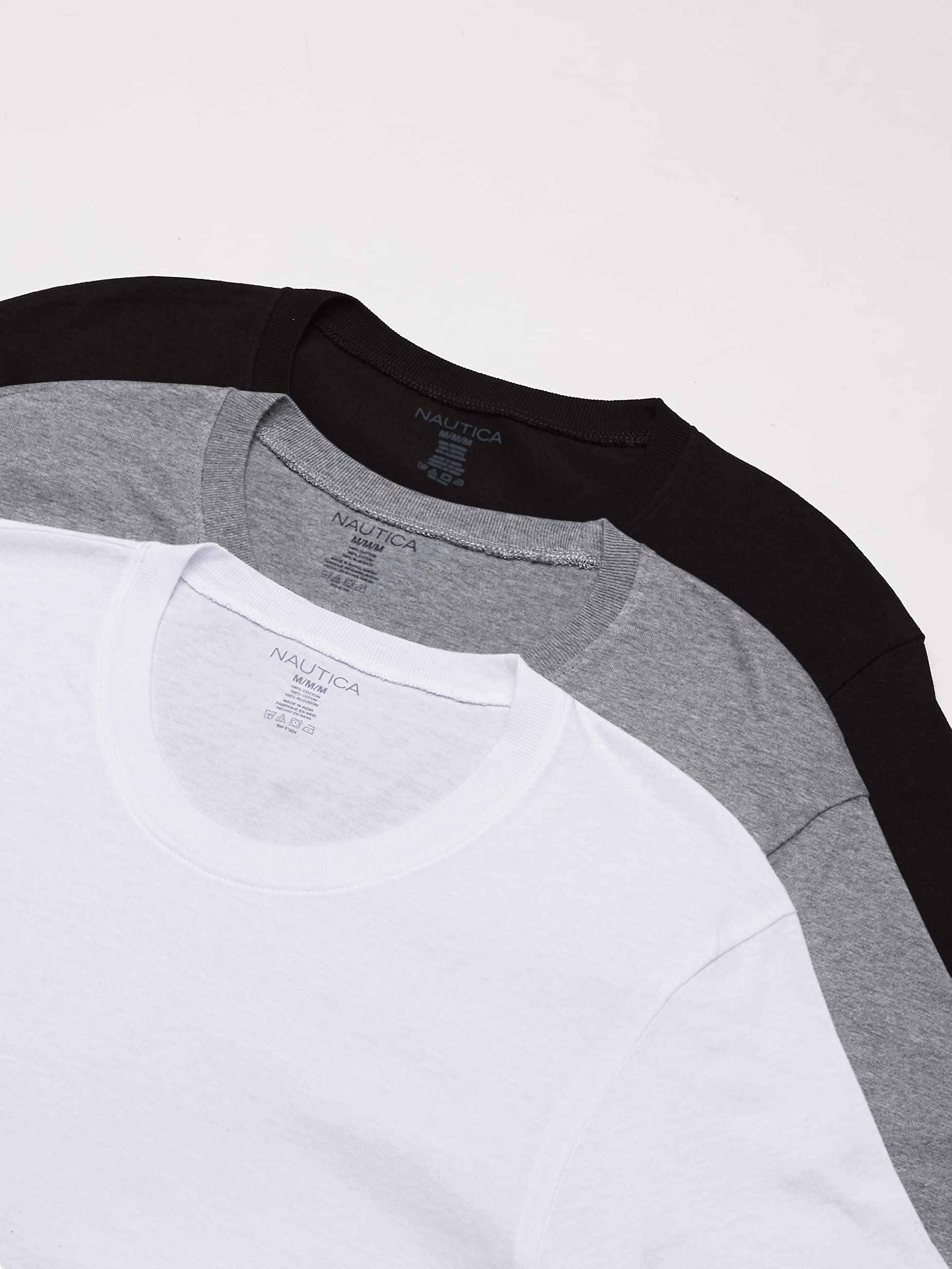 Description A timeless silhouette from Nautica offered in a pack of 3, these classic crew neck undershirts feature lightweight, super soft cotton fabric. Always tagless for ultimate comfort, these cotton t-shirts are perfectly tailored and will not bunch up under clothes. The flat ribbed collar will keep it's shape wash after wash. Short sleeve design finished with Iconic Nautica Sail logo at left hem.