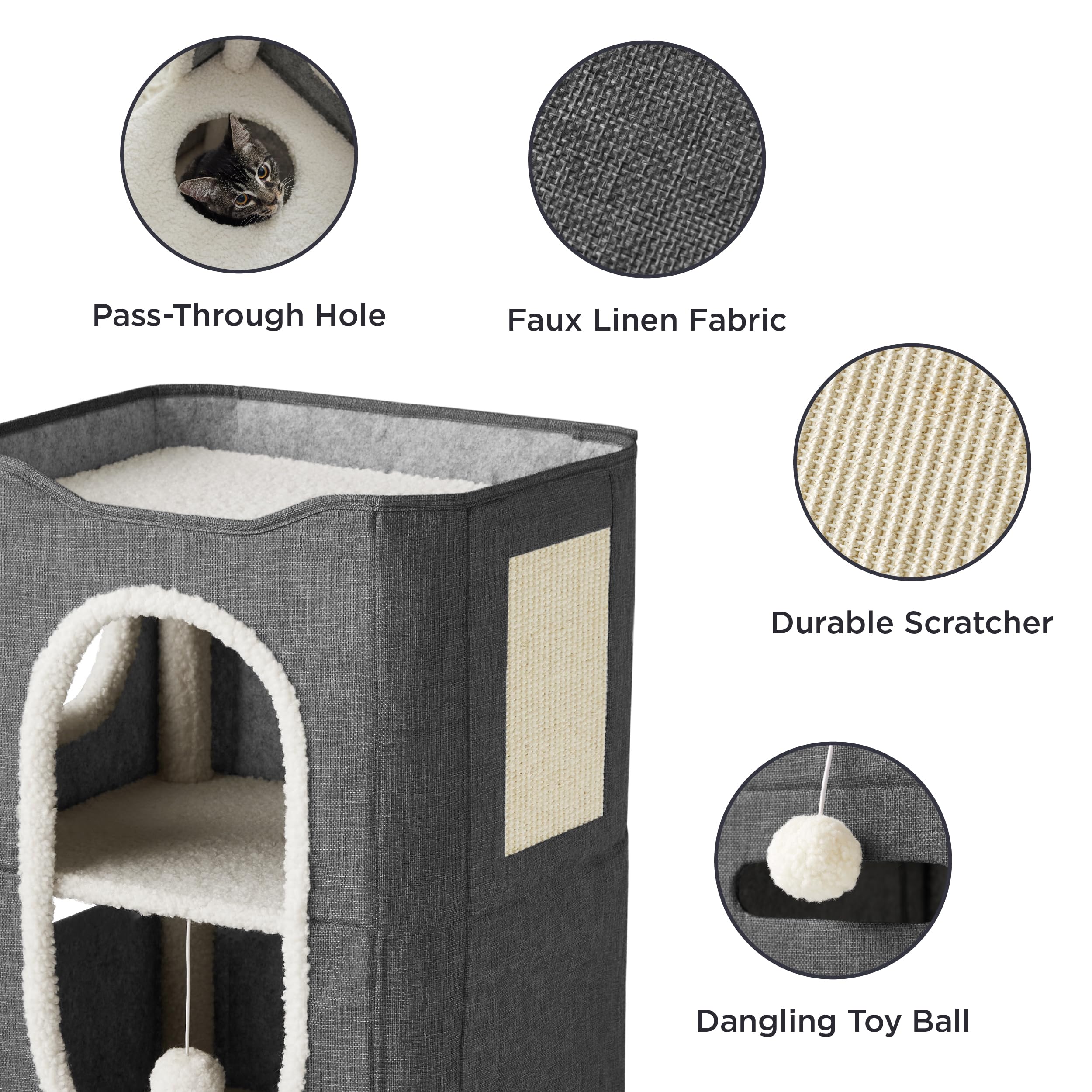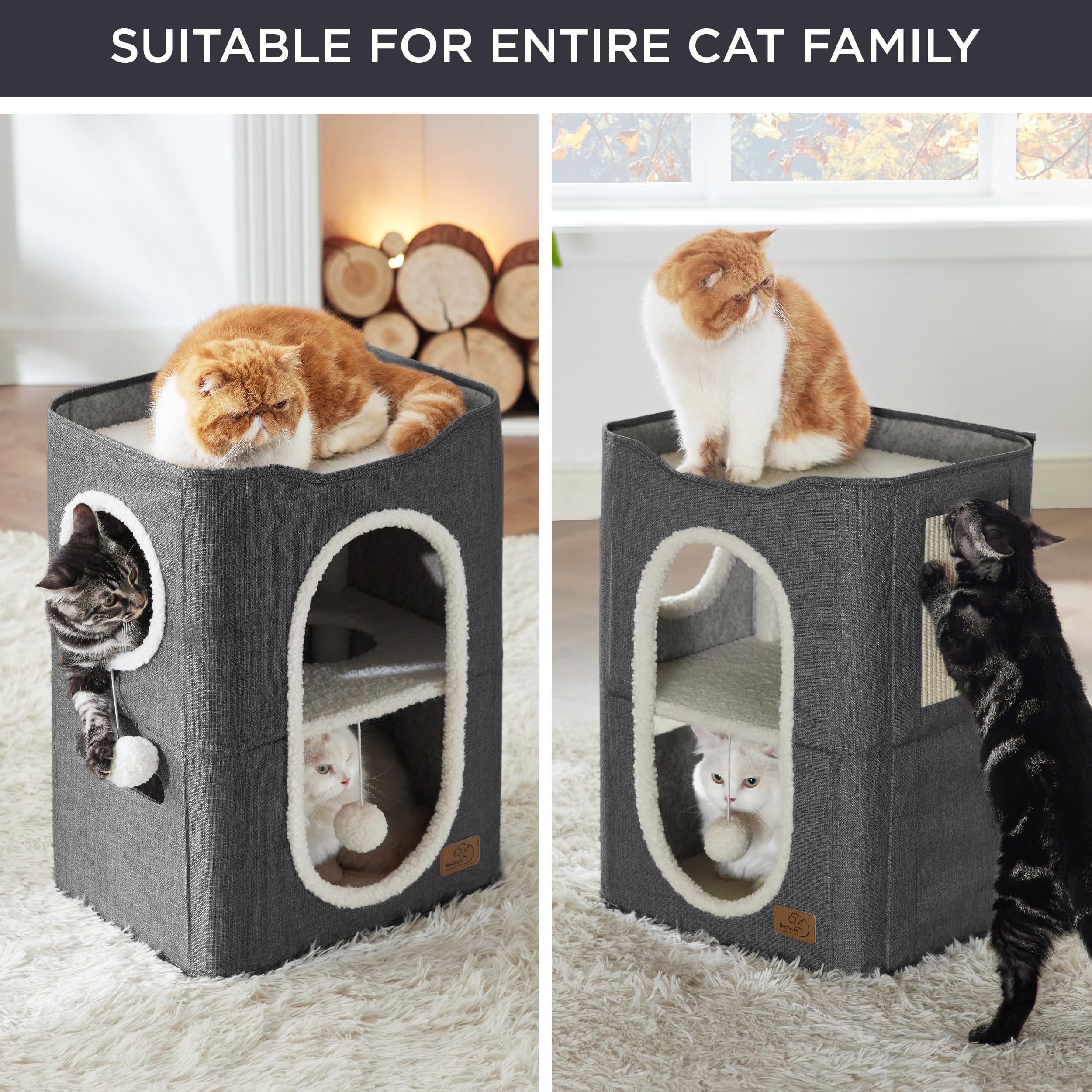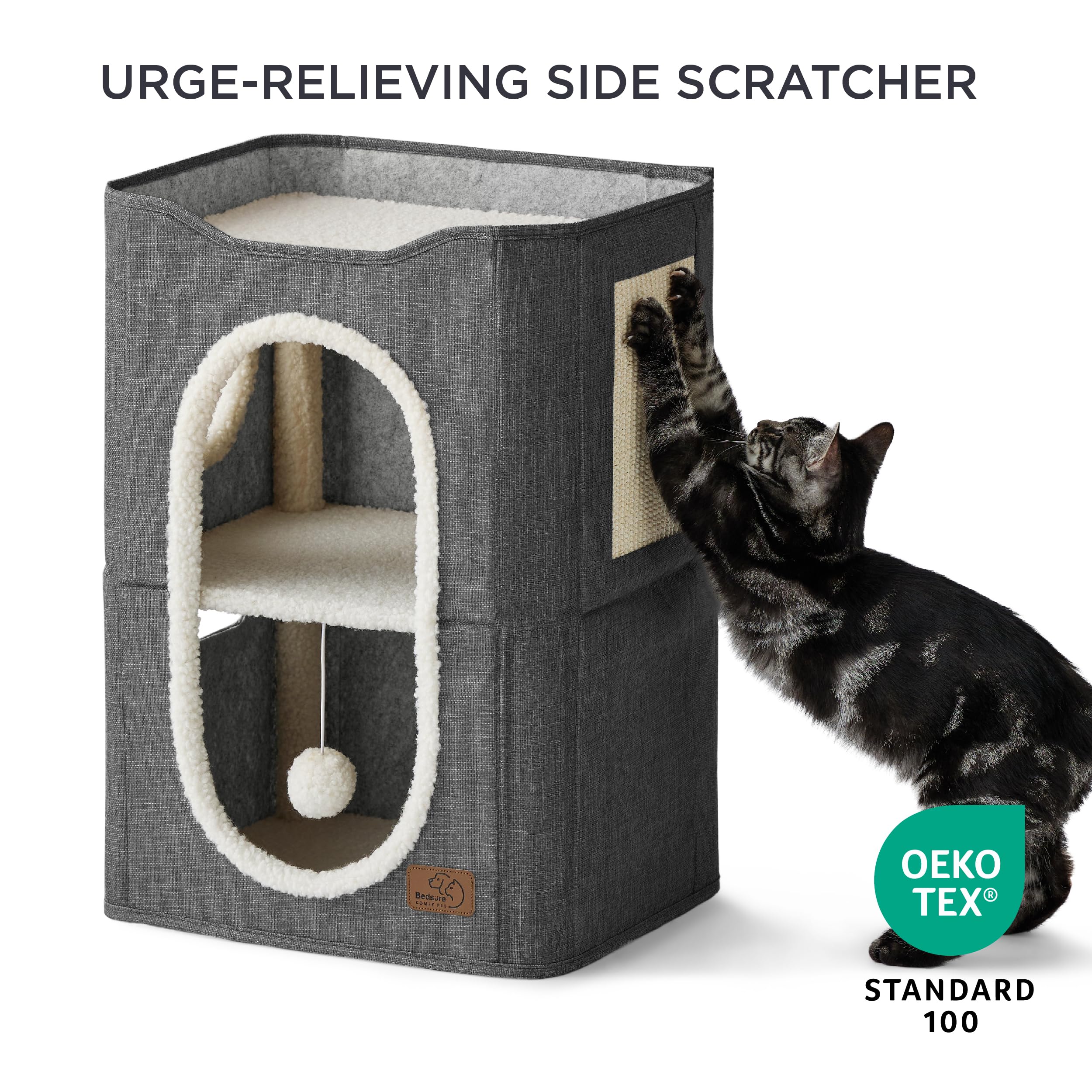 Pet-Safe Design: This 2-level cat house is crafted with CARB Certified high-strength medium density fiberboard and plush, gentle lambswool fabric for added comfort. Plus, it's got a sturdy sisal scratching board for hours of kitty entertainment.